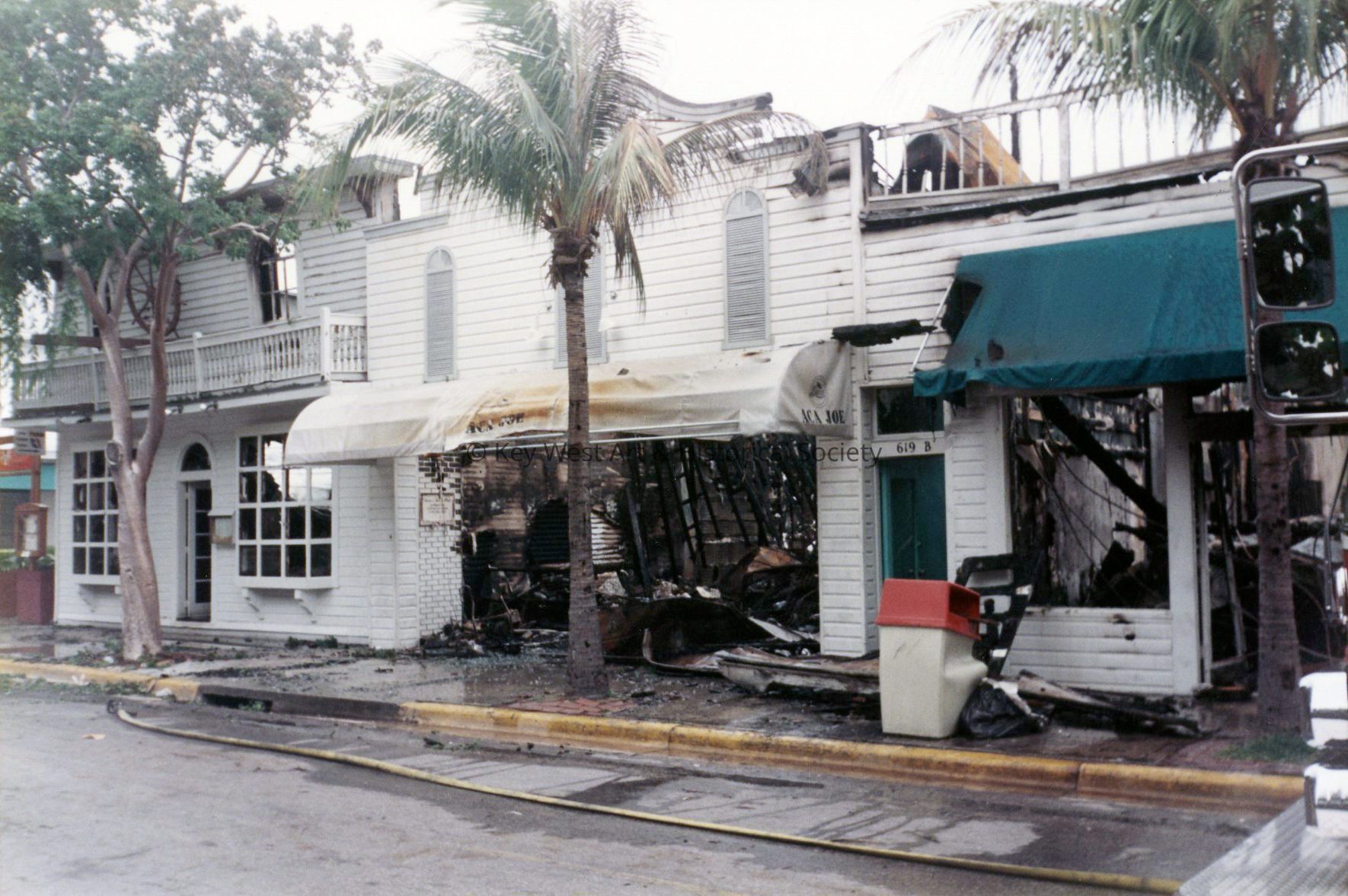 Color photograph of the damage sustained during a large fire at The Copa on the 600 block of Duval Street including Aca Joe.