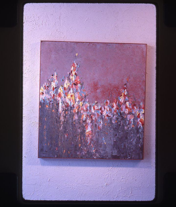35mm color slide depicting an untitled oil on canvas painting by Ron Clemons. The work is abstract and heavily textured with bright colors. The original painting is 40" by 44".