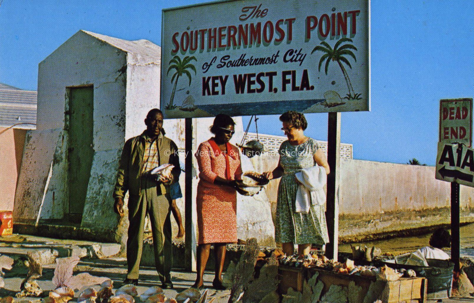 Postcard depicting the Southernmost Point.  The description on the verso reads, 'The Southernmost Point in continental U.S.A. is in Key West, Fla.  The natives here display giant conch shells for sale.'Collection
