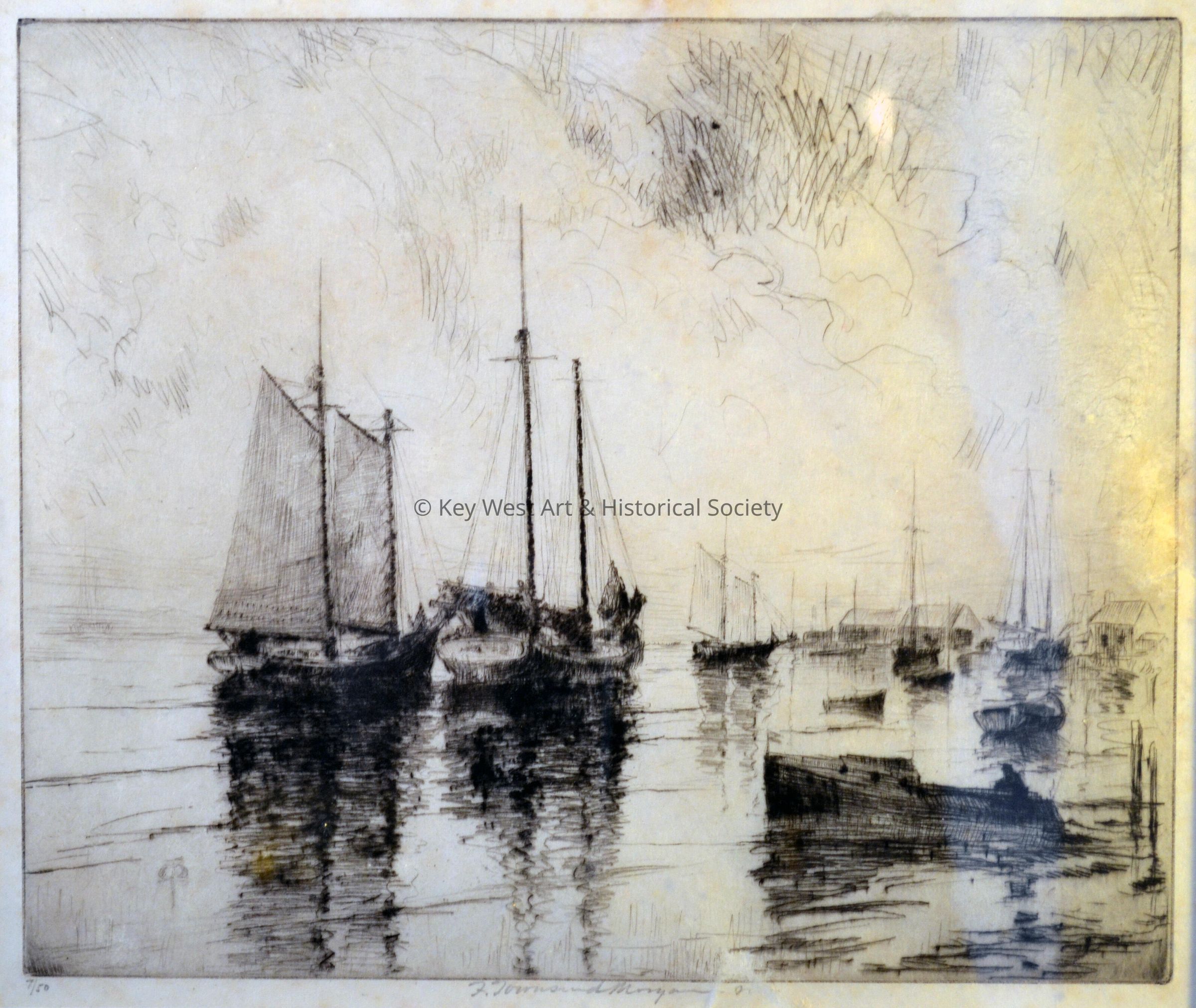 Lithograph print by F. Townsend Morgan depicting several sailing vessels at anchorage. Numbered 7 of 50.
