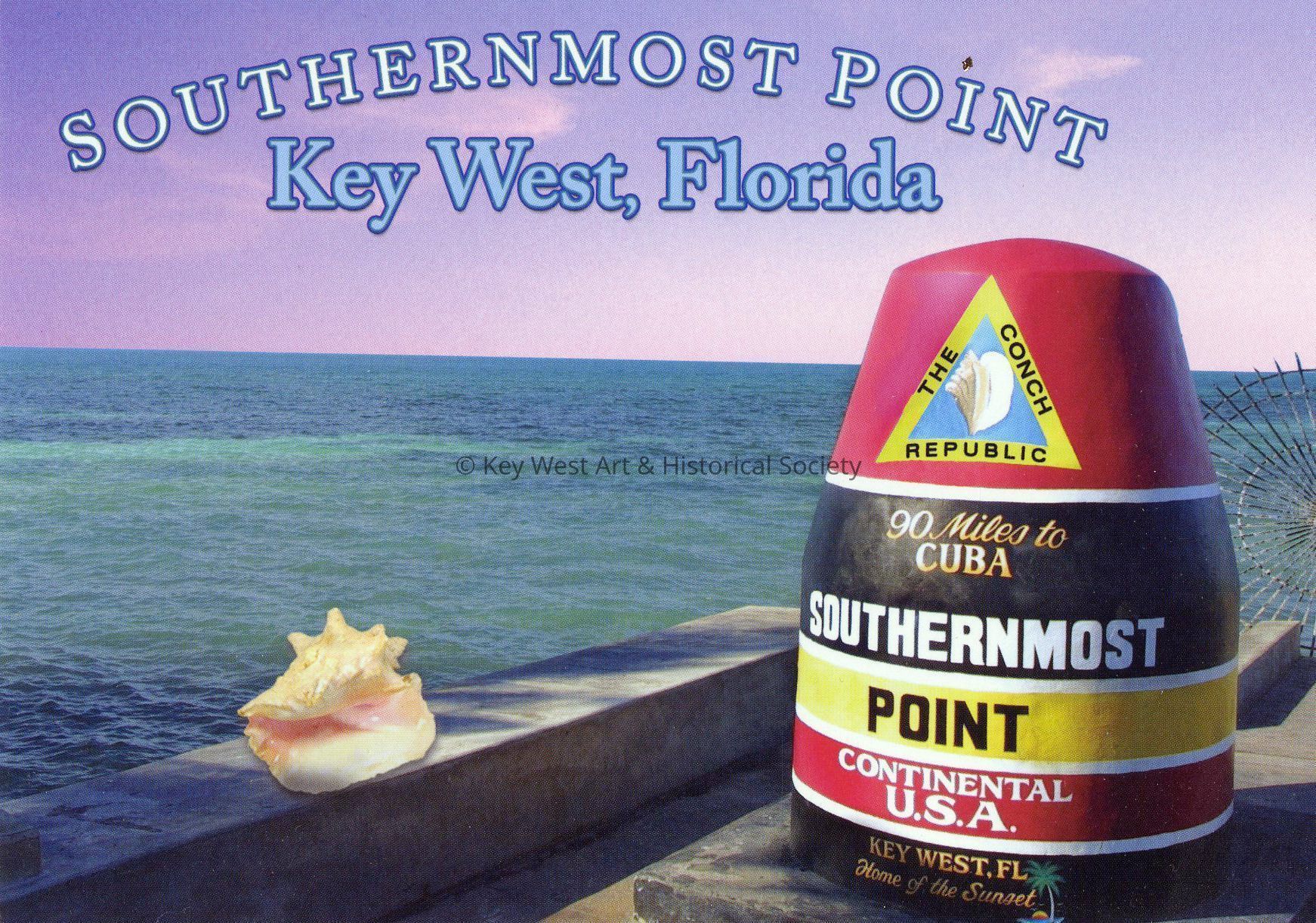 Color postcard depicting the Southernmost Point buoy at the corner of Whitehead and South streets.Subject Place