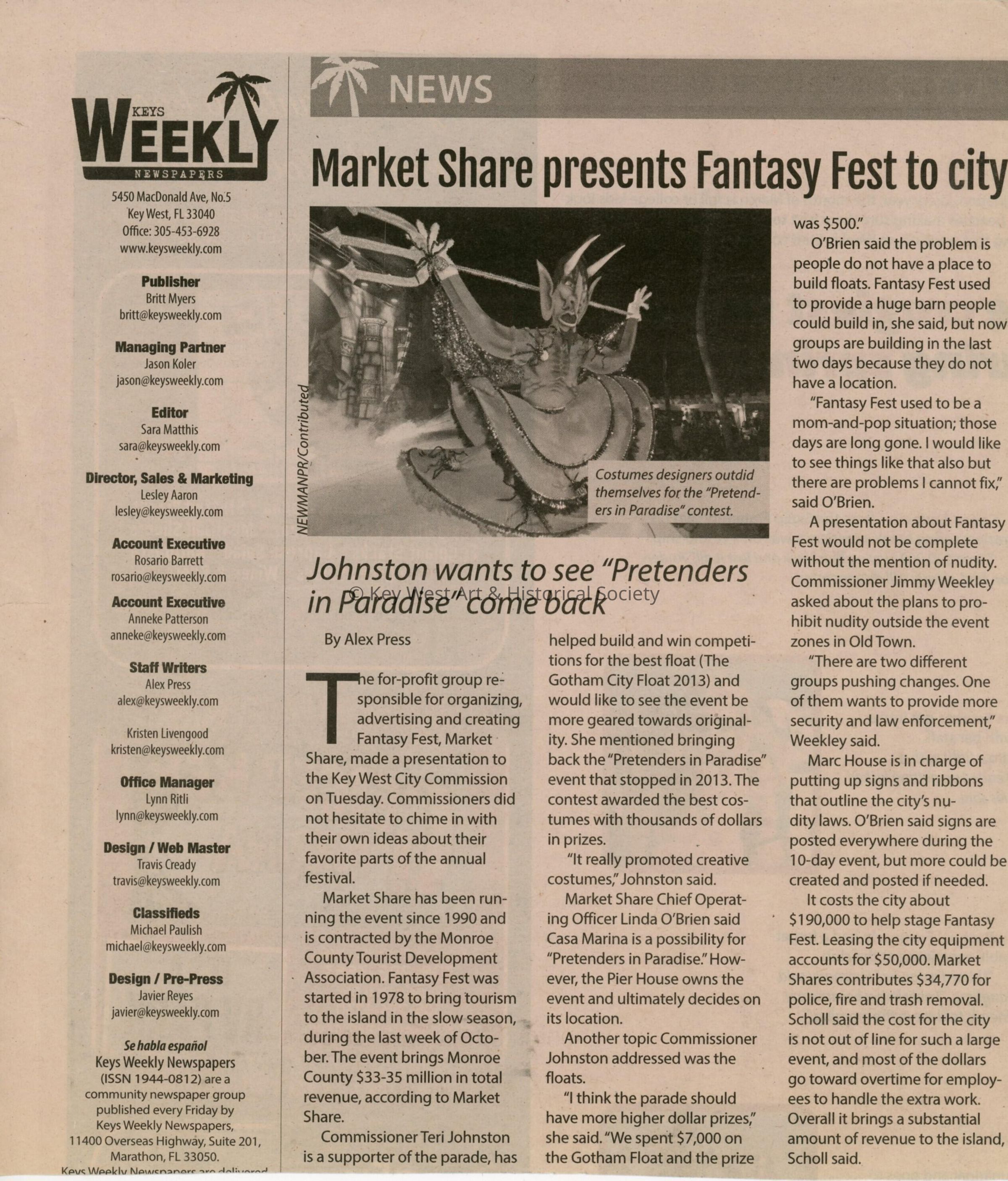 An article that reads Market Share presents Fantasy Fest to city in the Keys Weekly.