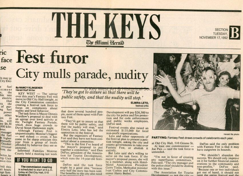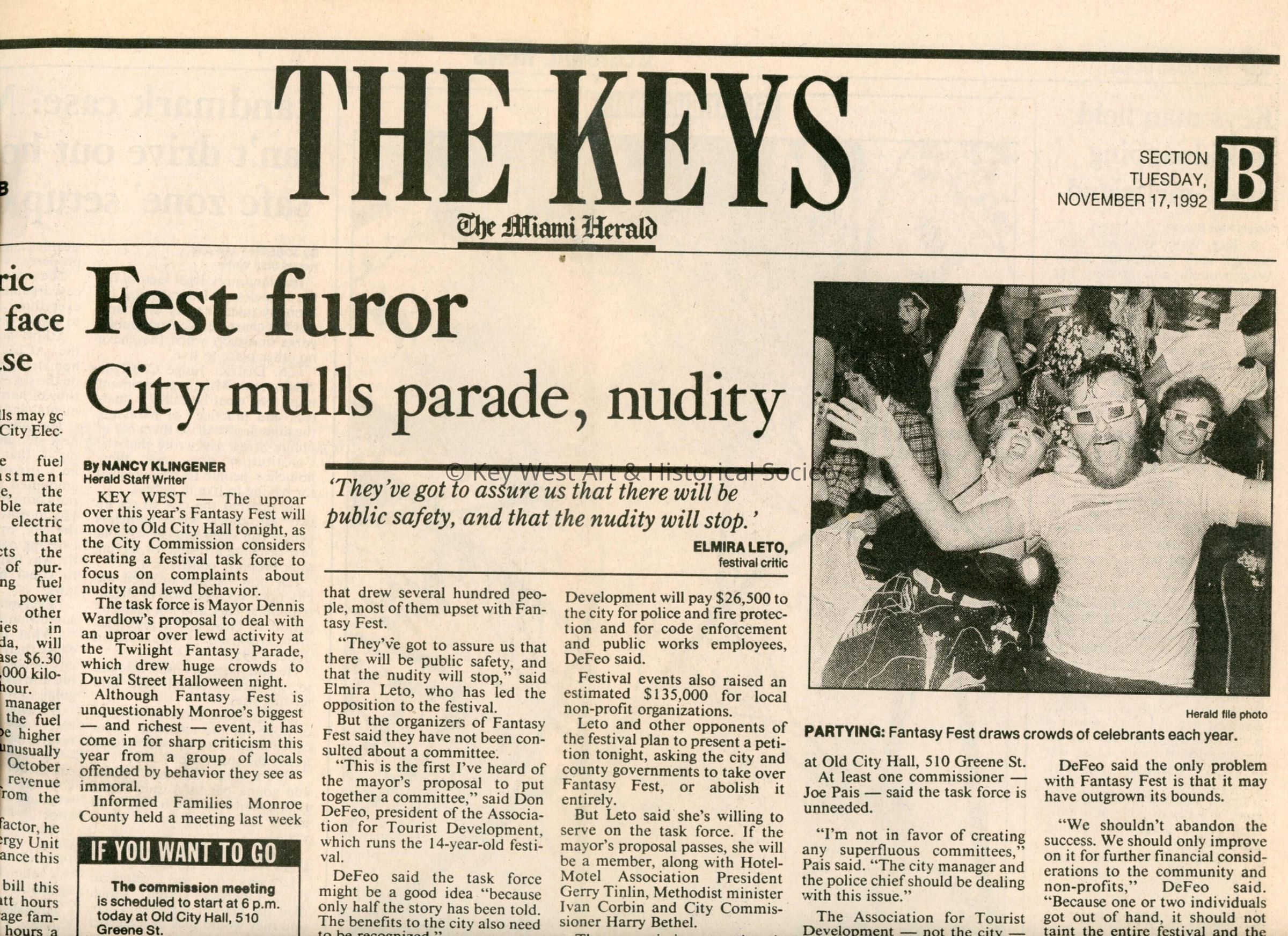An article in the Miami Herald that reads Fest furor city mulls parade nudity.