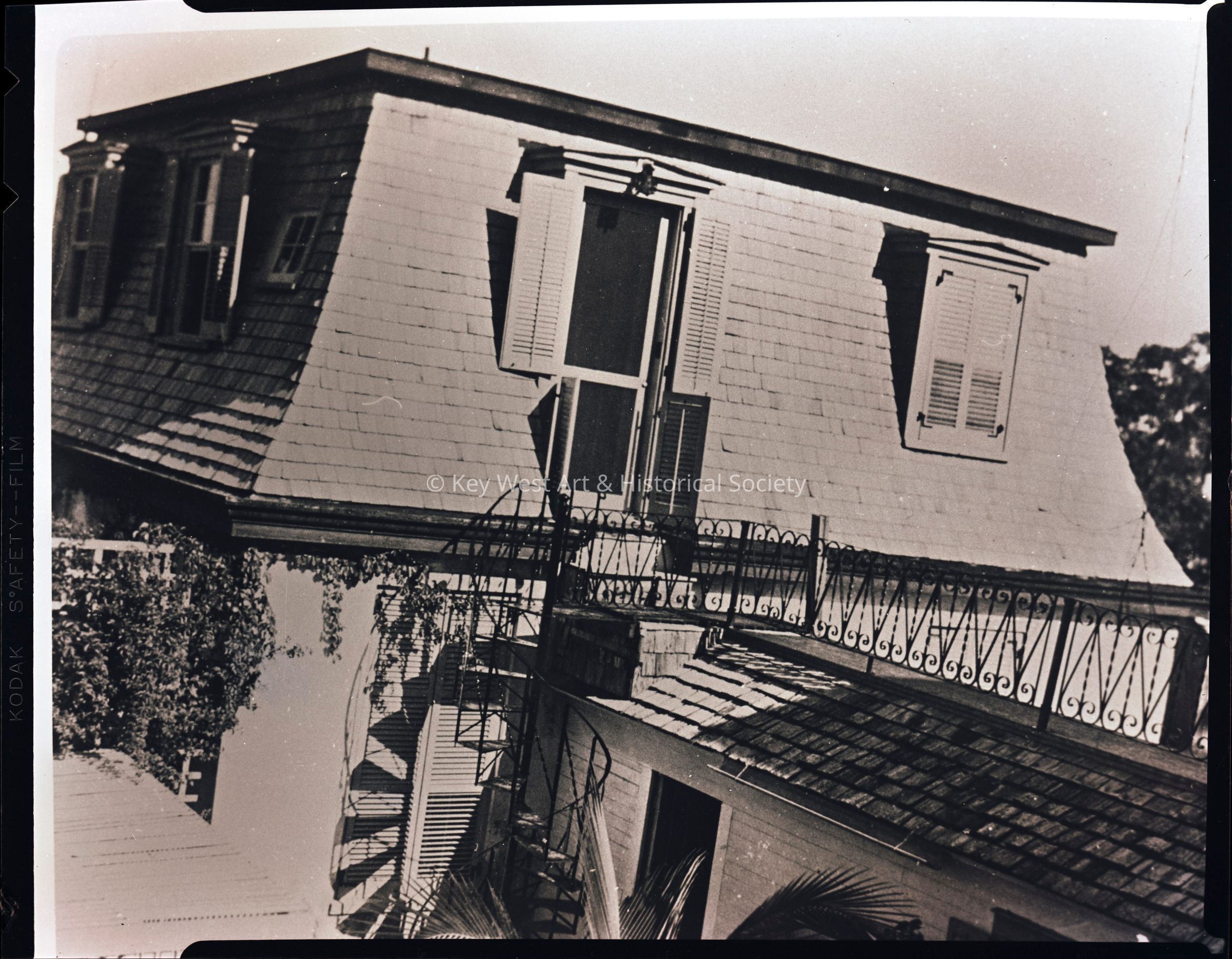 Black and white photographic negative depicting a building with a mansard style roof on the grounds of the Hemingway Home at 907 Whitehead Street. This ancillary building was used by Ernest Hemingway as his writing studio.