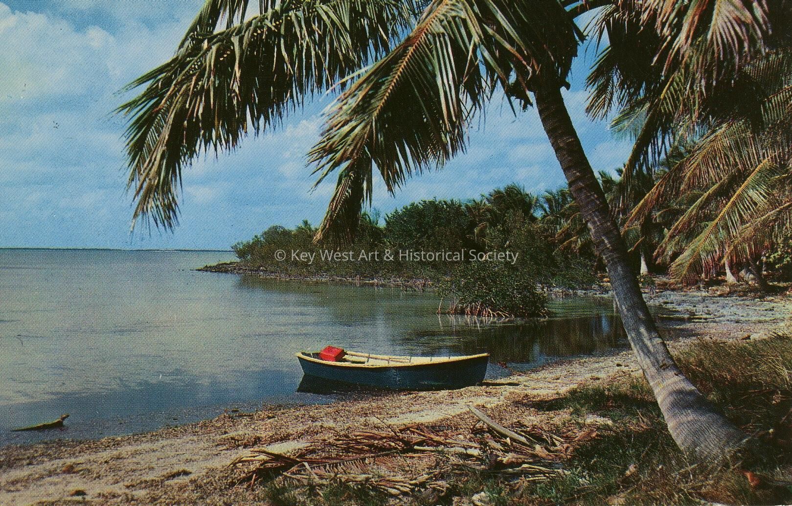 Postcard depicting a small boat on a beach along the Florida Keys. Description on verso reads, 'Typical scene on the Florida Keys.'Subject Place