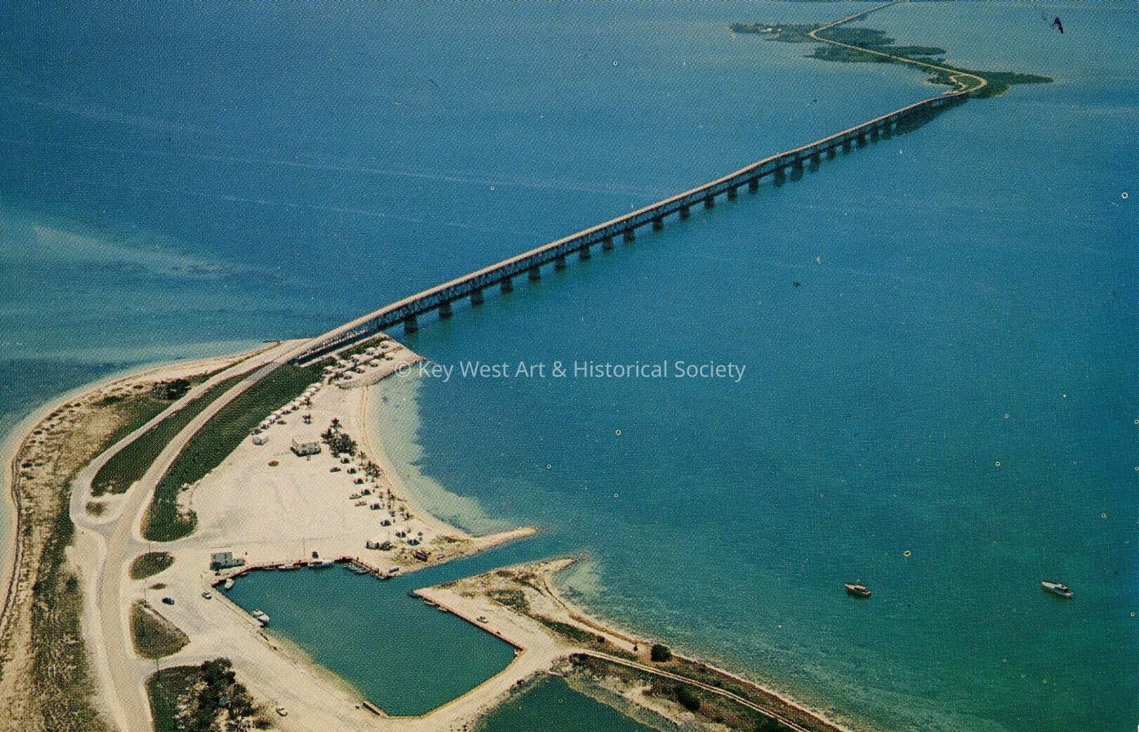 Postcard depicting an aerial view of the old Bahia Honda Bridge. Description on verso reads, 'One of the most famous bridges, linking the mainland to Key West, the beautiful BAHIA HONDA with its picnic area, as seen from the air.'Subject Place