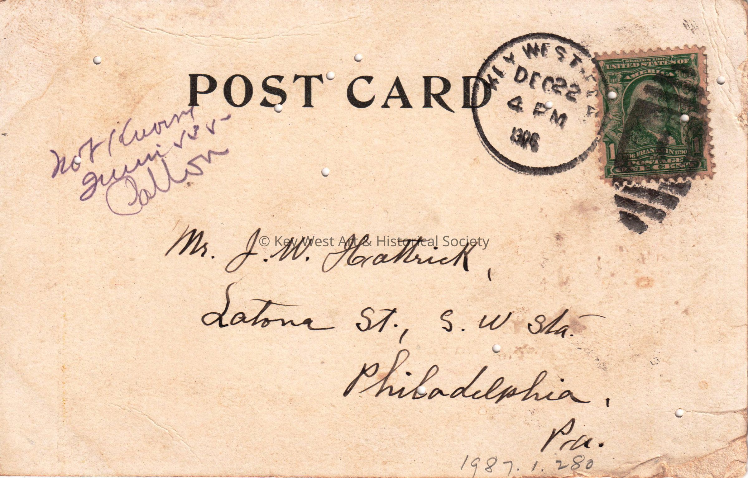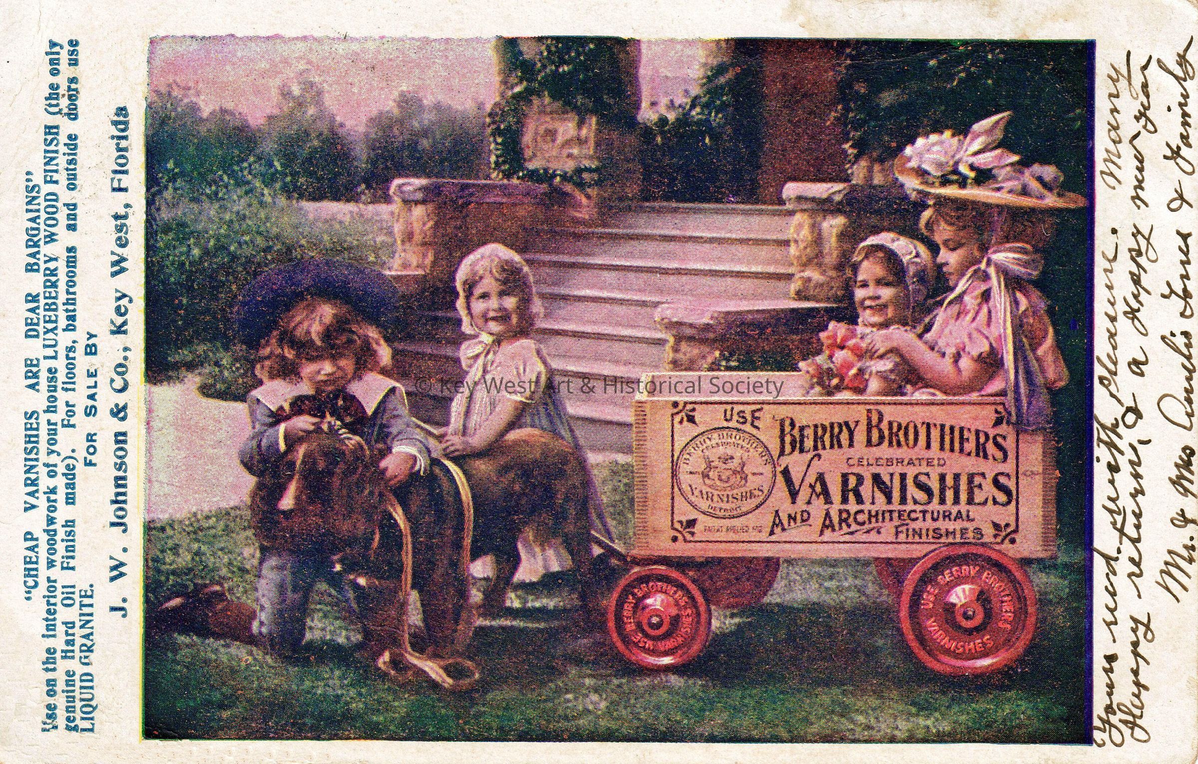 Postcard depicting children with a dog and a wagon that advertises, ‘Use Berry Brothers celebrated varnishes and architectural finishes.’  The printed advertisement on the recto reads, ‘Cheap varnishes are dear bargains.  Use on the interior woodwork of your house Luxeberry wood finish (the only genuine hard oil finish made).  For floors, bathrooms, and outside doors use liquid granite.  For sale by J. W. Johnson Company, Key West, Florida.’Subject Place