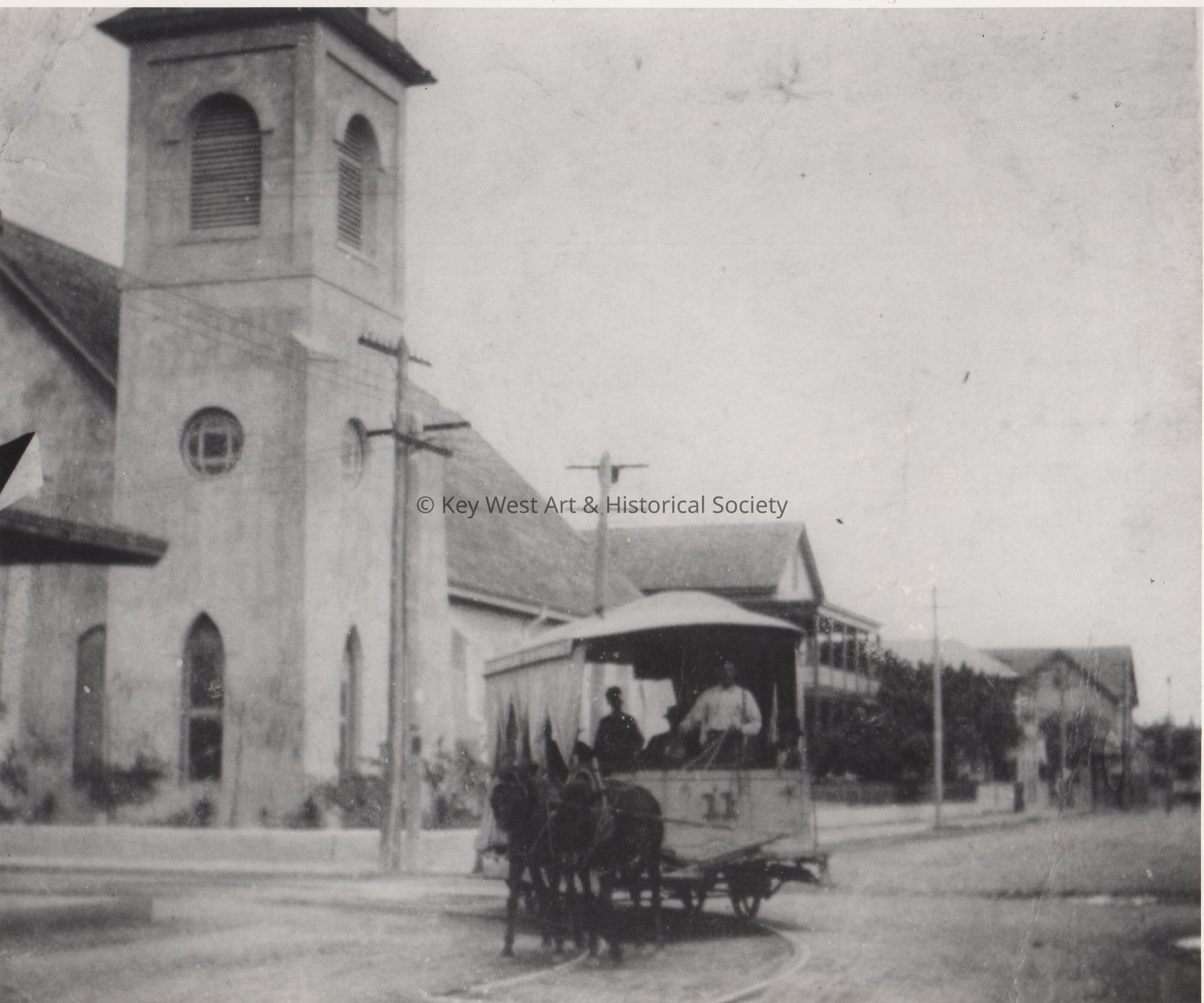 Mule-drawn streetcar near the Old Stone Methodist Church.Collection