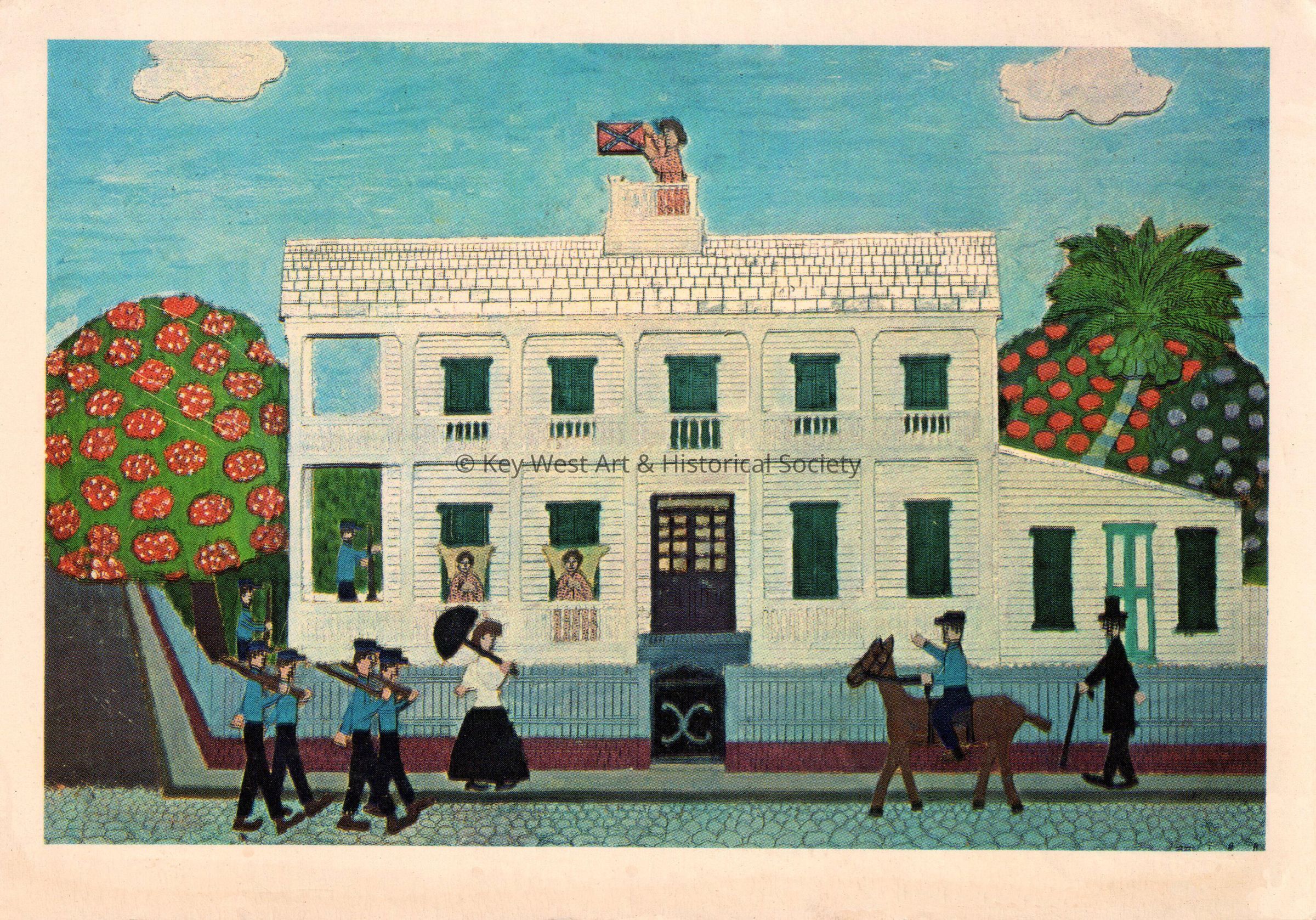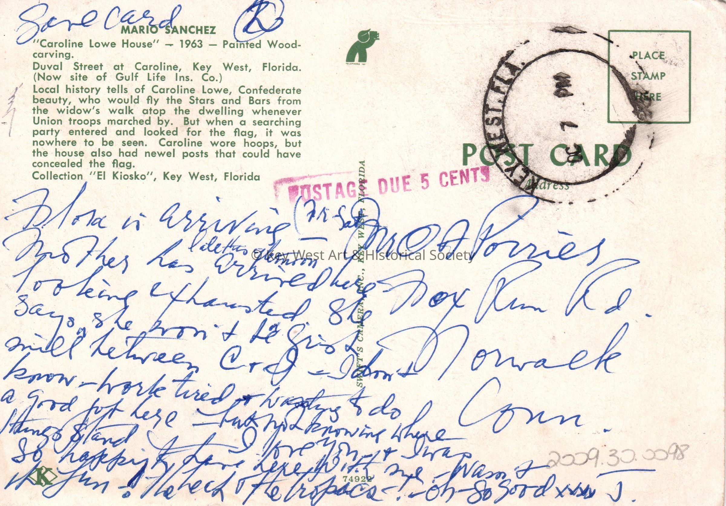 Postcard depicting a woodcut of a house with a Confederate flag, women on the front porch, and soldiers marching in the street.  The description on the verso reads, ‘Caroline Lowe House – by Mario Sanchez 1963 – Painted Woodcarving.  Duval Street at Caroline, Key West, Florida.  (Now site of Gulf Life Ins. Co.)  Local history tells of Caroline Lowe, Confederate beauty, who would fly the Stars and Bars from the widow’s walk atop the dwelling whenever Union troops marched by.  But when a searching party entered and looked for the flag, it was nowhere to be seen.  Caroline wore hoops, but the house also had newel posts that could have concealed the flag.  Collection “El Kiosko”, Key West, Florida.’  The message on the verso reads, ‘Same Card, 2, Flora is arriving (Friday or Saturday).  Mother has (late this afternoon) arrived here looking exhausted.  She says she won’t be a grist mill between C and I.  I don’t know, work tired and wanting to do a good job here, but not knowing where things stand.  I love you and was so happy to have here with me - wasn’t it fun.  The heck to the tropics.  Oh, so good, J’.  The card is addressed to Mr. O.A. Poirier, Fox Run Road, Norwalk, Connecticut, and is postmarked Key West.Collection