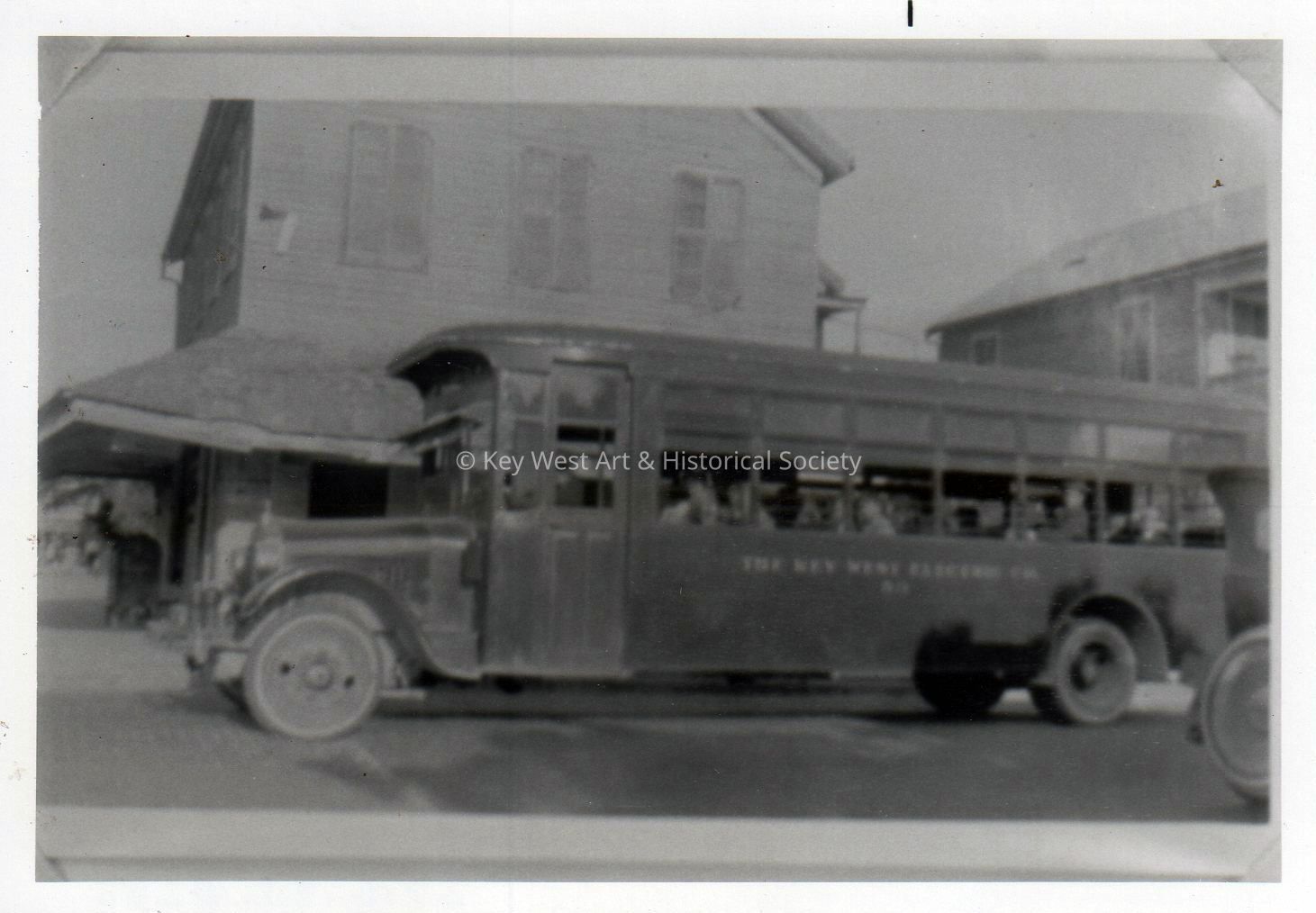 Black and white photograph of an early Key West City Electric Bus at the corner of Margaret and Fleming streets.