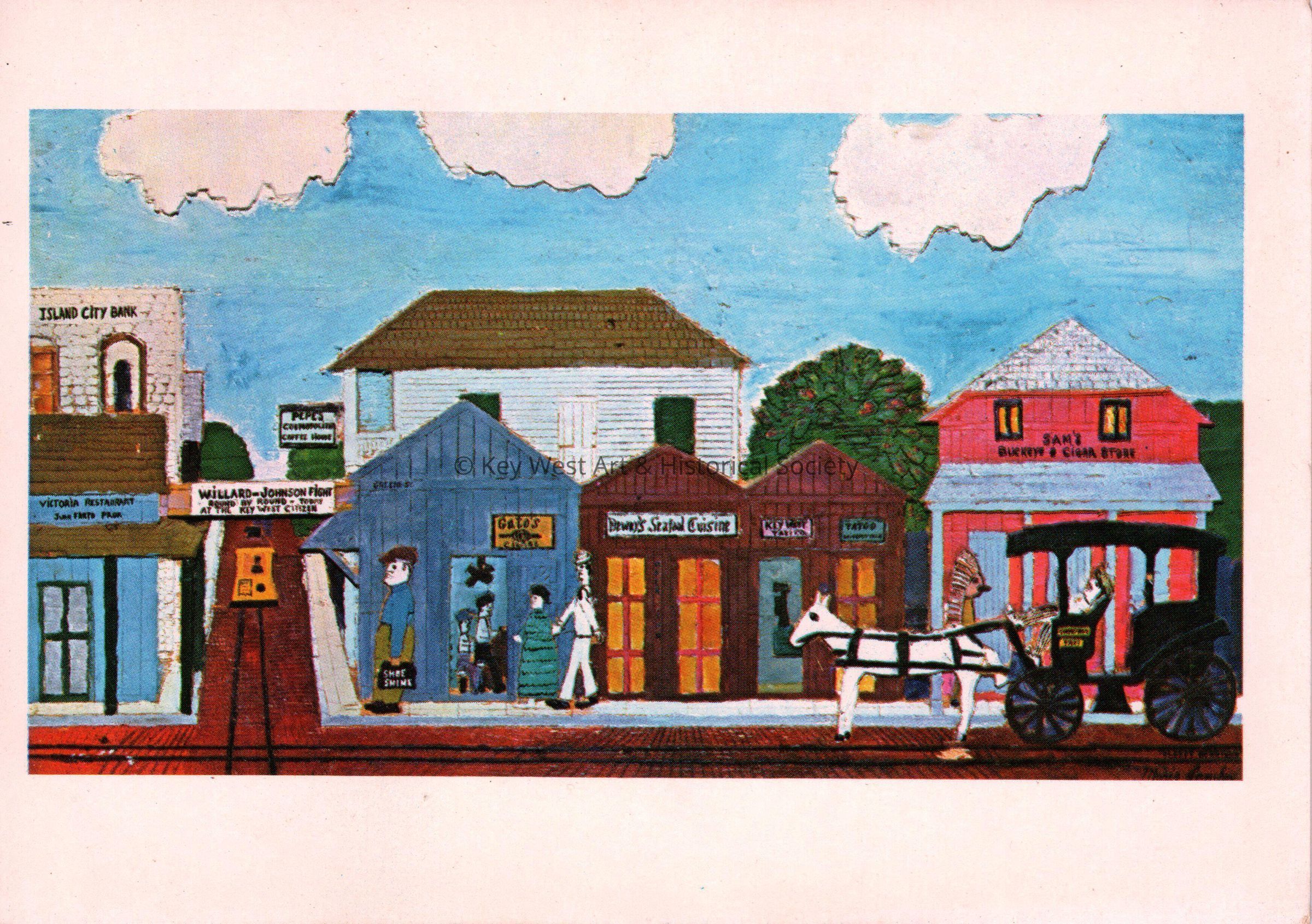 Postcard depicting a Mario Sanchez woodcarving of a trolley, horse and carriage, and people on a city street. Signs on the buildings read, ‘Island City Bank; Victoria’s Restaurant; Willard Johnson Fight, round by round, today at the Key West Citizen; Greene Street; Gato’s Cigars; Dewey’s Seafood Cuisine’. The description on the verso reads, 'Mario Sanchez. "Sleepy Downtown" - 1963 - Painted Woodcarving. Typical old Key West is represented here by the intersection of Greene Street and Duval (main) Street. Building at left can even today (1965) be recognized as Sloppy Joe's Bar. Other quaint buildings are today the site of gift shops and a saloon and farther along, for many years, this section of Greene Street was a carriage stand and later a taxi stand. This is around the corner from Pepe's Cafe (Duval Street), and down the block from Audubon House. The cigar store Indian was one of many that stood in front of Key West coffee houses and tobacco shops. The sailor indicates that this is a Navy town with an entrance to the Naval Base nearby on Greene Street. Collection "El Kiosko", Key West, Florida.'Subject Place