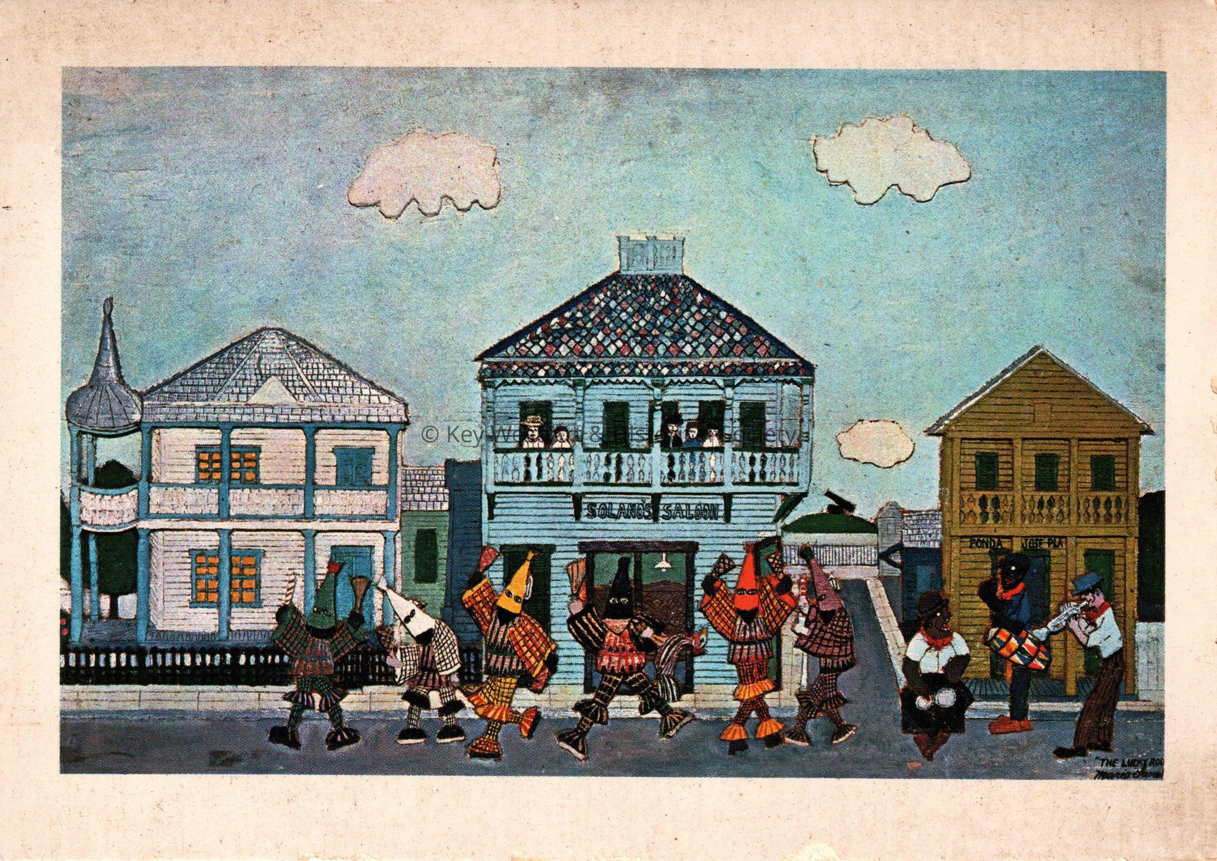 Postcard depicting a Mario Sanchez woodcarving of people dancing and playing instruments in front of the Island Saloon.   The description on the verso reads, 'Mario Sanchez.  "Lucky Rooster" - 1962 - Painted Woodcarving.  One of the most beautiful of the Sanchez Key West carvings depicts a secret cult, the Nanigos, performing its initiation ceremonies at corner of Whitehead and Petronia Streets.  The "Nanigos" used a half-dead rooster in their rites, and should the person being initiated survive a konk on the head by the rooster, he could become a member of the cult.  The red and white striped sticks are symbolical as are the green tree branches.  Note the odd fringe at knees, ankles and waists of the hooded costumes; and the bongo drums and cornet used to produce Afro music.  The colorful central buildings, with Solano family on balcony, has a Captain's Walk on roof.  White dwelling with blue trim (left) is today (1965) beautifully maintained and is part of the Solano estate.  Building center today houses Padron's Grocery.  It was used in a scene of the movie "all Fall Down" (Novel by James Herlihy), portions of which were photographed here by Metro-Goldwyn-Mayer Director John F. Frankenhammer.  In distance, at end of Petronia Street, is one of old Fort Zachary Taylor's mounted guns of yesteryear.  Building (left) was Fonda Jazz Place.  Private collection.'Subject Place