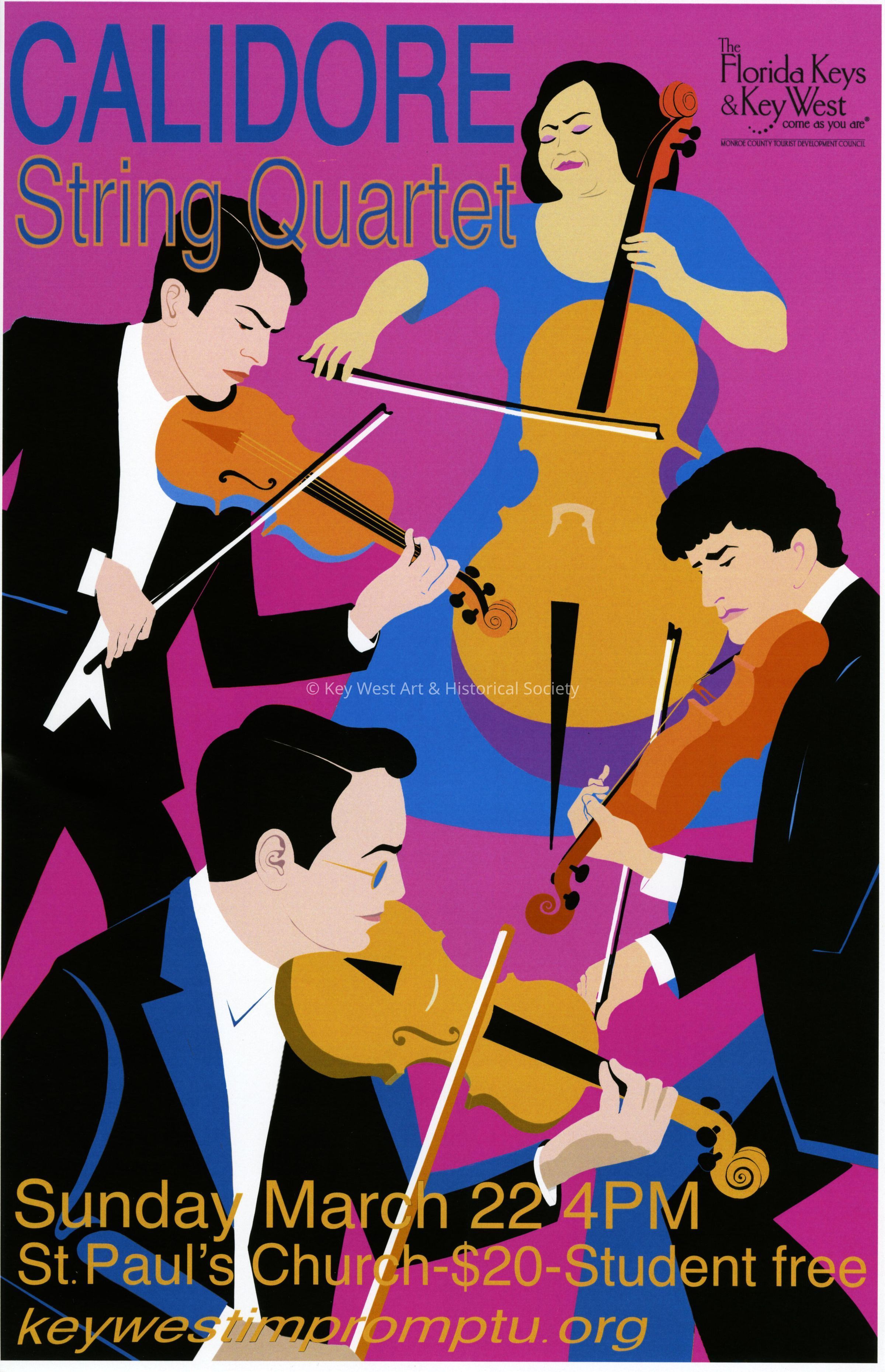 An advertising poster for Impromptu Classical Concerts entitled 'The Calidore String Quartet'. The concert took place on March 22, 2020 at St. Paul's Church, 401 Duval Street.Collection