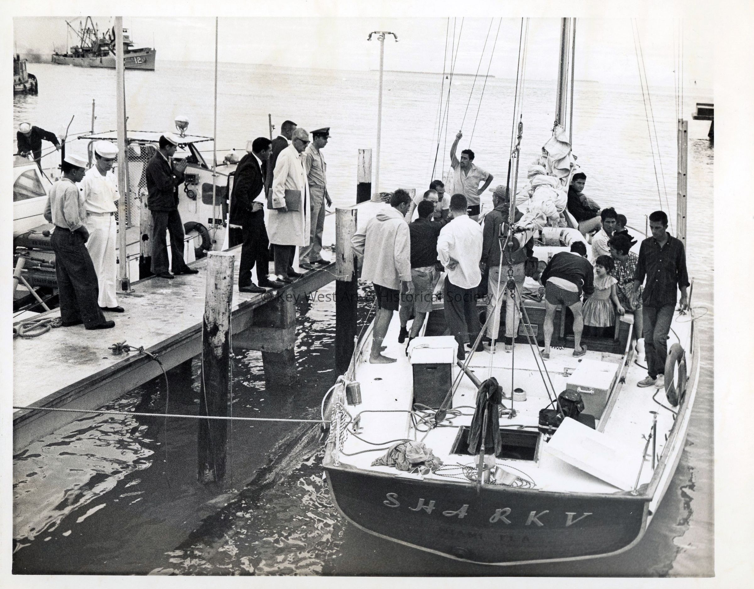 Black and white photograph of Cuban refugees aboard the sailing vessel SHARK V during the Camarioca Boatlift.