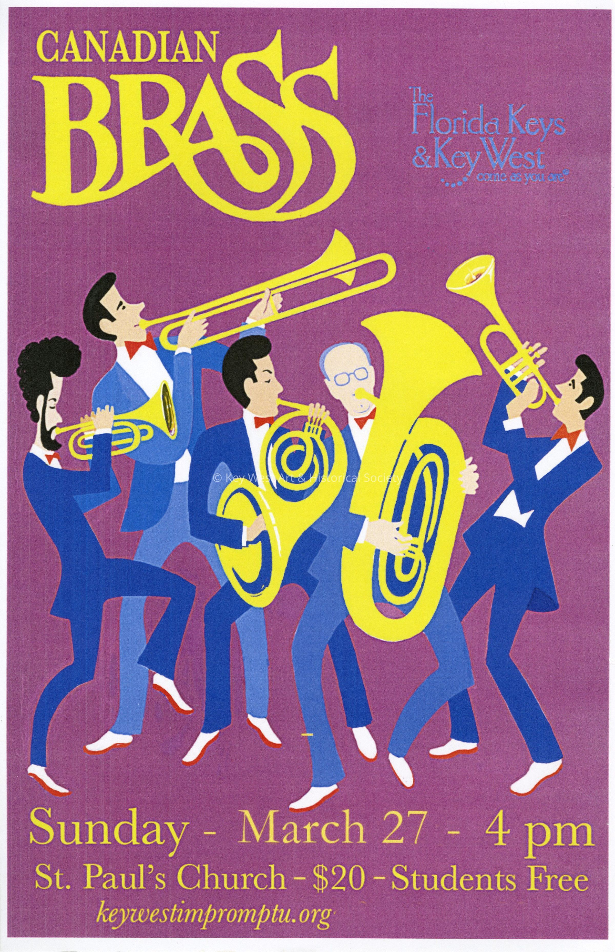 An advertising poster for Impromptu Classical Concerts entitled 'Canadian Brass'. The concert took place on March 27, 2022 at St. Paul's Episcopal Church at 401 Duval Street.Collection