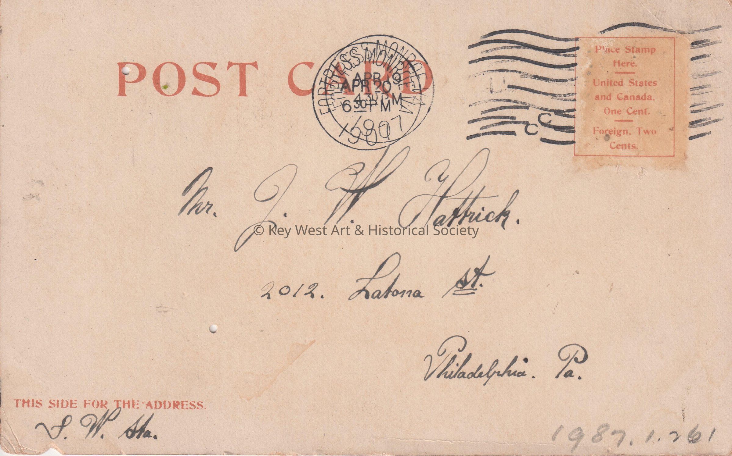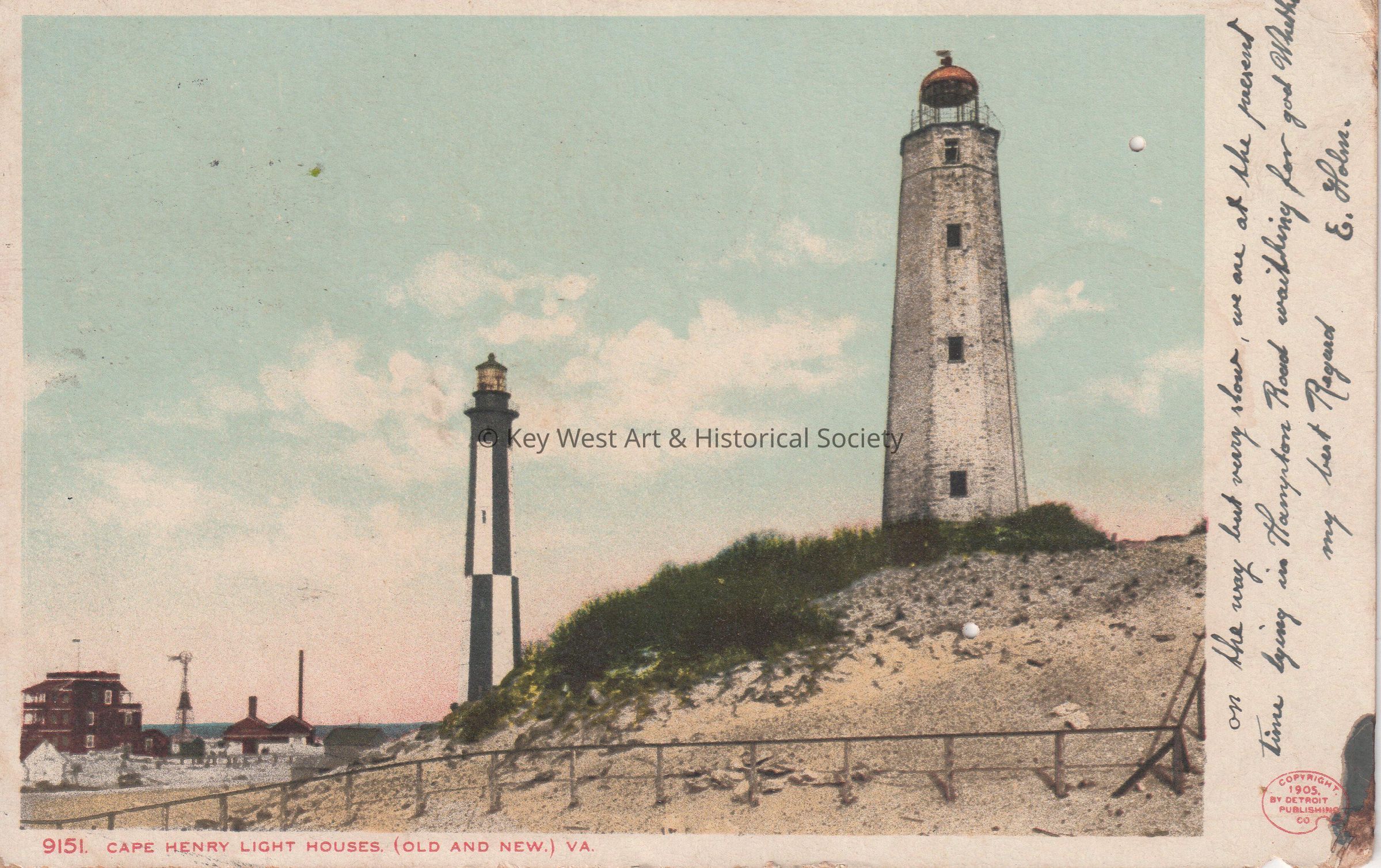 Postcard depicting two lighthouses on the dunes. The caption reads, ‘Cape Henry Light Houses (old and new), Va.’ The message on the front reads, ‘On the way but very slow, we are at the present time lying in Hampton Roads waiting for good weather. My best regards, E. Holm’. The card is addressed to Mr. J. W. Hattrick, 2012 Latona Street, Philadelphia, Pennsylvania, Southwest Station, and is postmarked Fortress Monroe, Virginia, April 20, 1907.Collection