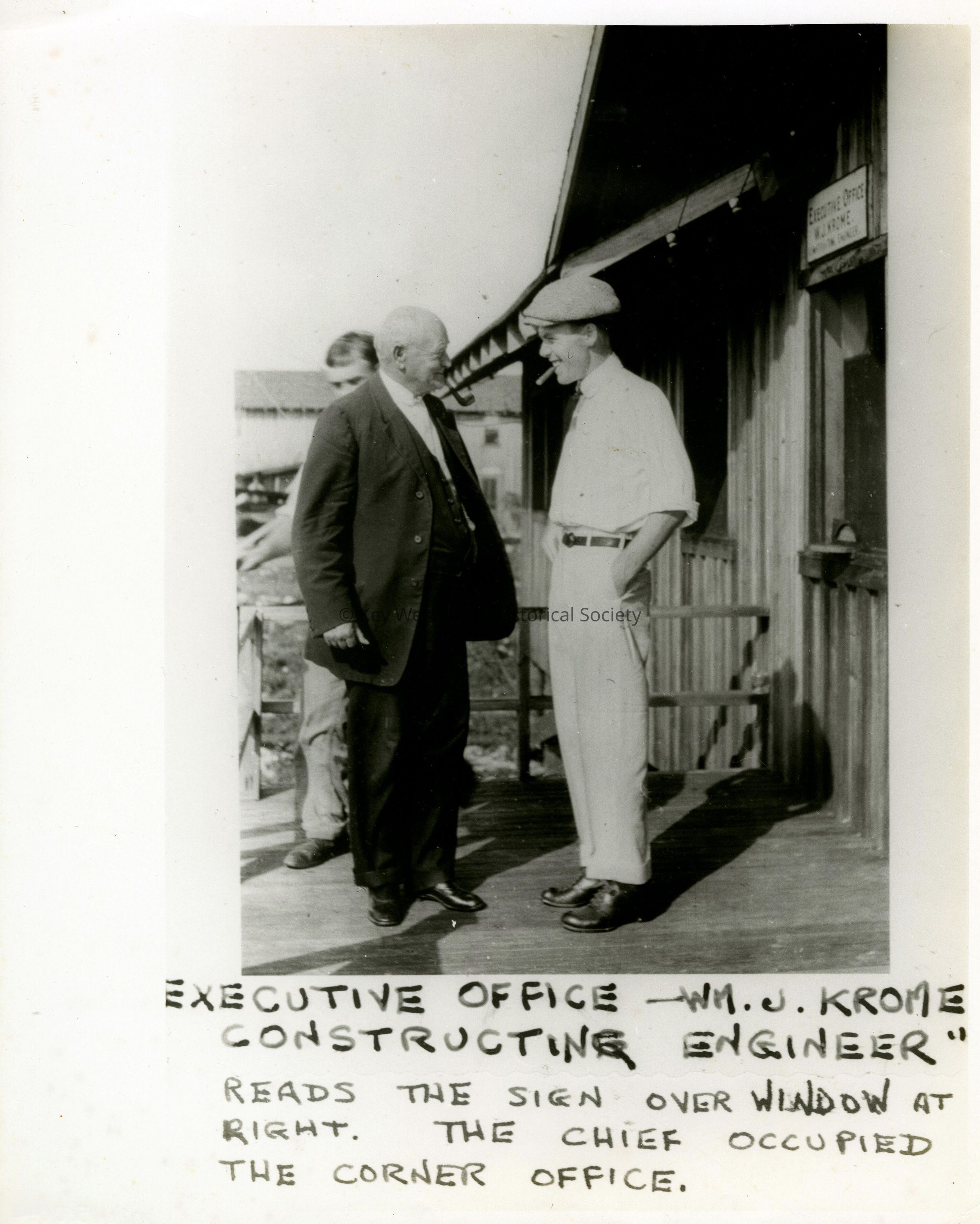 Black and white photograph of Captain B. A. Deal (l) , auditor of construction and Carlton Corliss (r) in front of the office of William J. Krome, construction engineer for the Florida East Coast Railway Company.Photograph Details