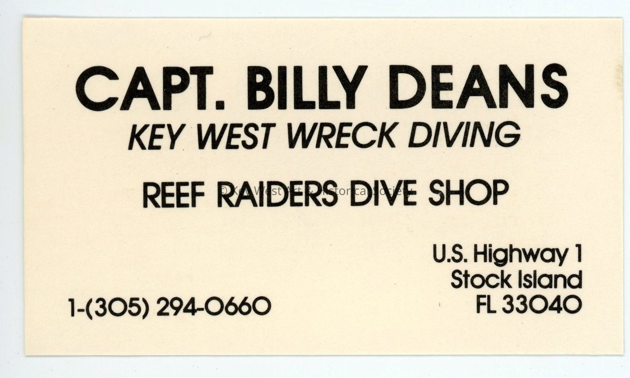 A business card for Captain Billy Deans, Key West Wreck Diving and the Reef Raiders Dive Shop formerly located on U.S. Highway 1 on Stock Island.