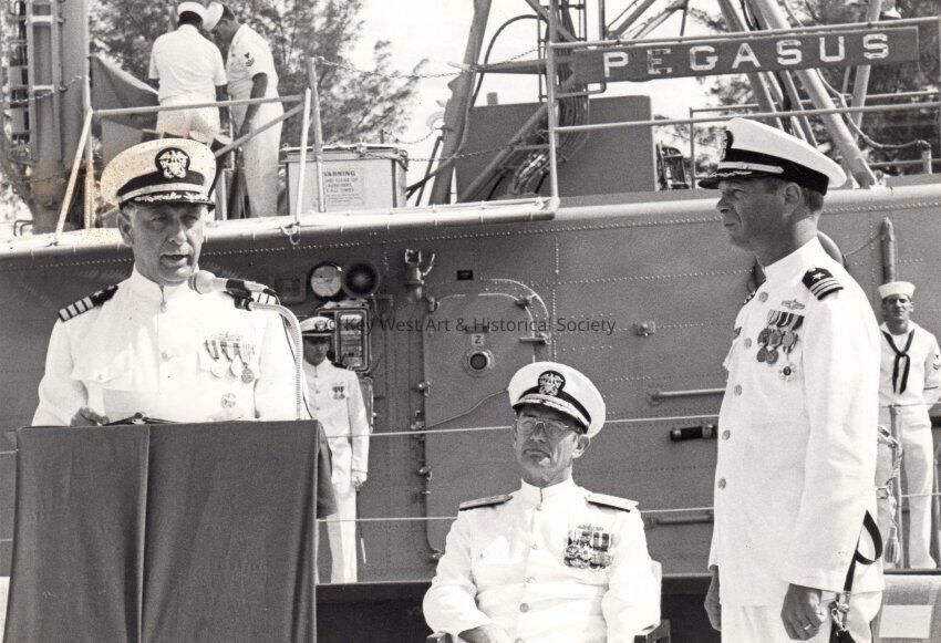 In front of the "Pegasus", Captain Frank G. Horn, USN, (left) assumes duties as Commander Patrol Combatant Missile Hydrofoil Squadron Two from Commander L.M. Hardt, USN (right) as Rear Admiral Peter C. Conrad, USN, Commander Cruiser Destroyer Group Twelve (center) observes.Collection