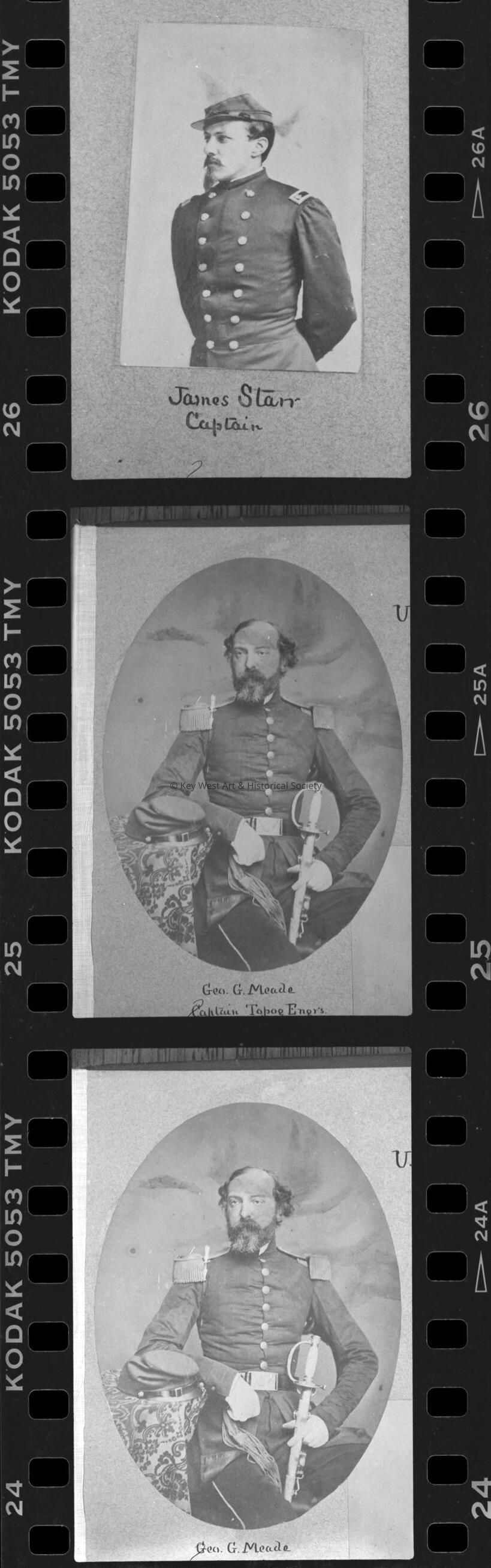 Black and white 35mm film of two Civil War captains. Captain James Starr and two views of Captain George Gordon Meade when he was in the Corps of Topographical Engineers.