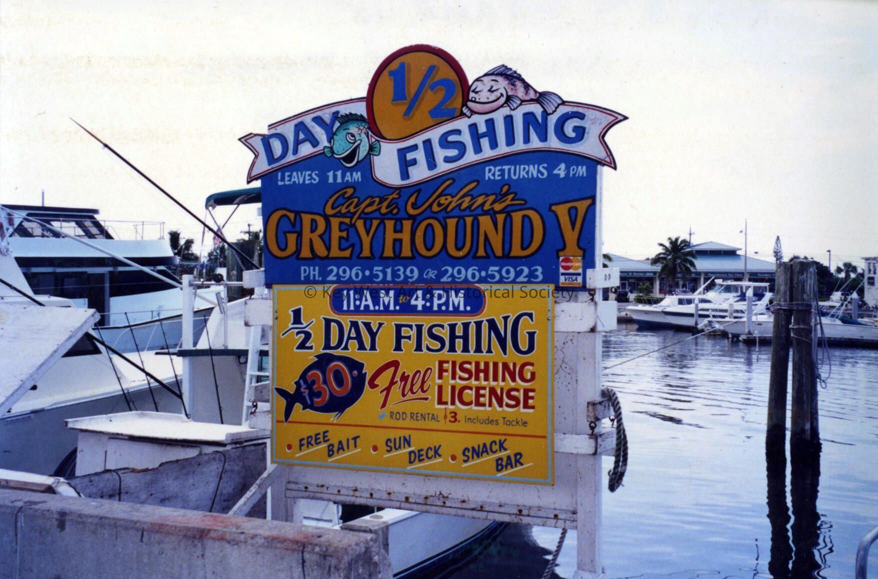Color photograph taken by historian James M. Goode of the Captain John's Greyhound V sign at Garrison Bight Marina during a trip to Key West in August 2001. Printed from Roll 15.