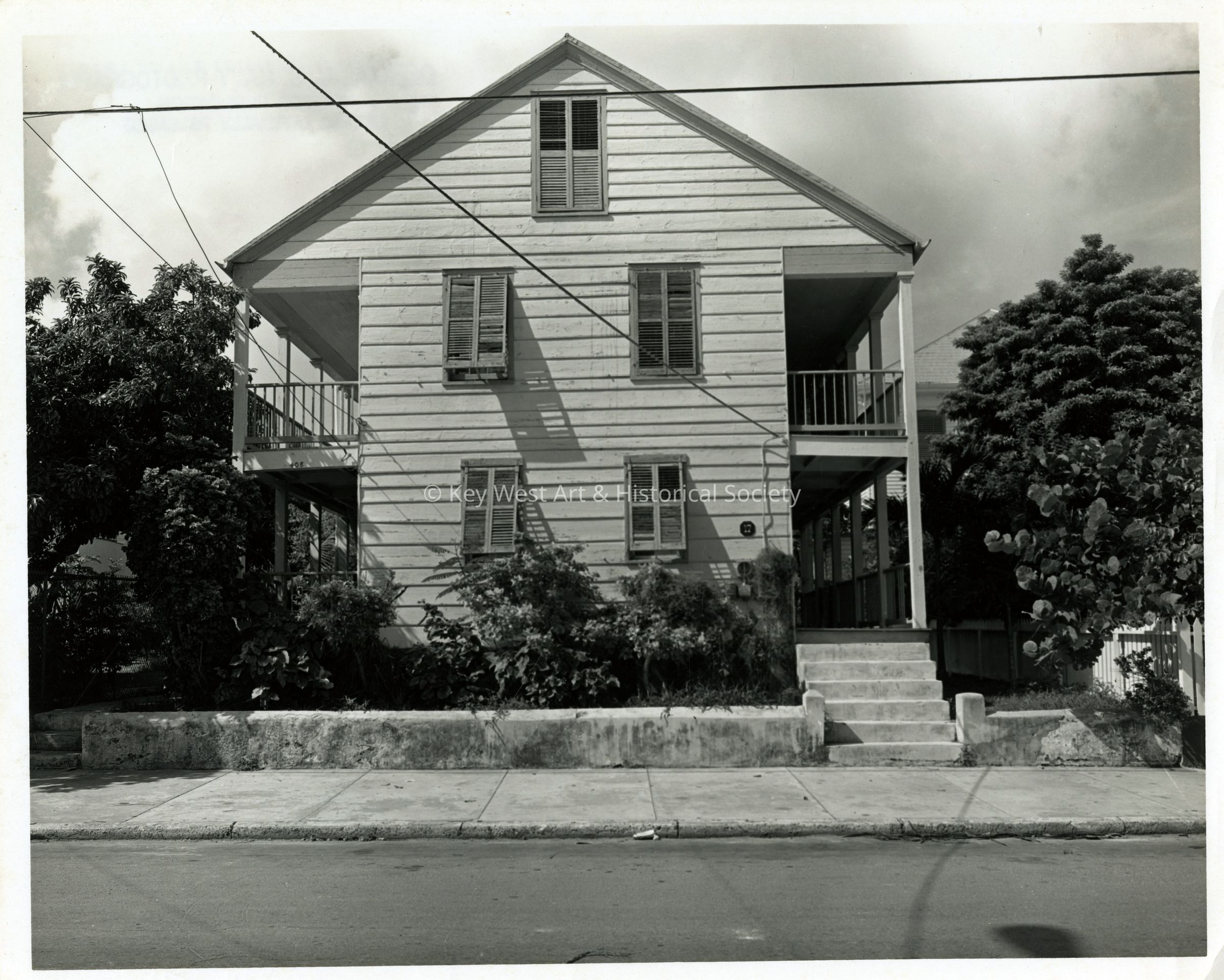 Black and white photograph of the Captain Richard Tuggy Roberts House at 408 William Street. It is one of two houses referred to as the Bahama House because it was originally constructed in Green Turtle Cay, Abaco, Bahamas. Following the Key West Hurricane of 1846, Roberts disassembled his home, put it on a barge bound for Key West, then reassembled in its current location.Photograph Details