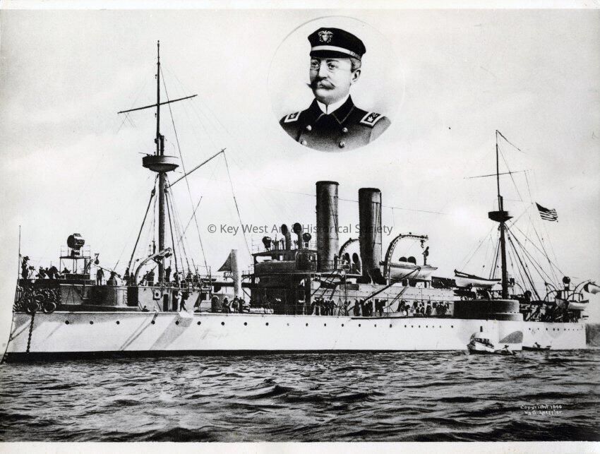 Port side view of the Battleship U.S.S. MAINE at anchor. An inset of Captain Charles Dwight Sigsbee is over the ship's midsection.Collection
