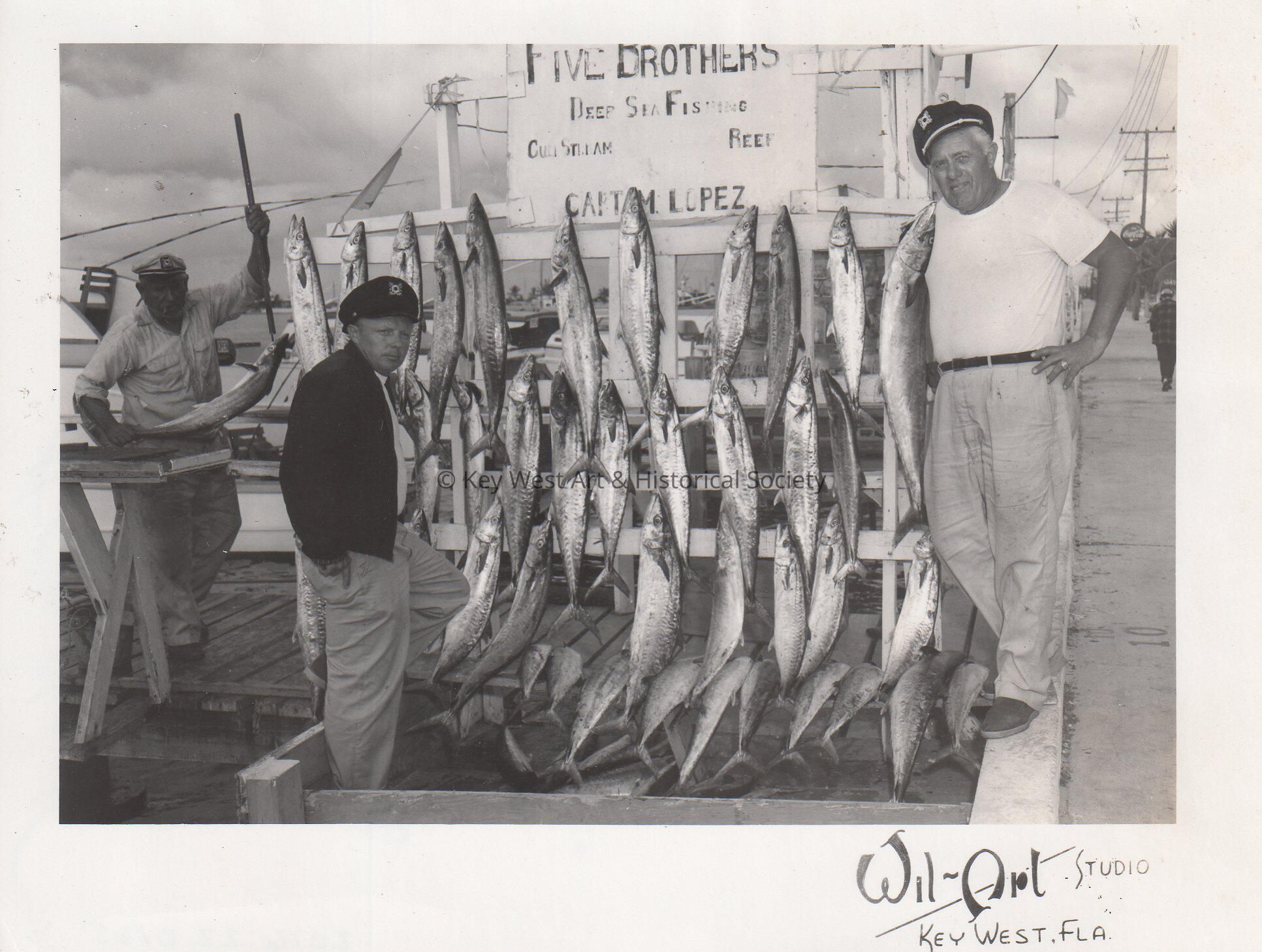 Black and white photograph of a catch made on the charter boat Five Brothers with Captain Lopez on the right.