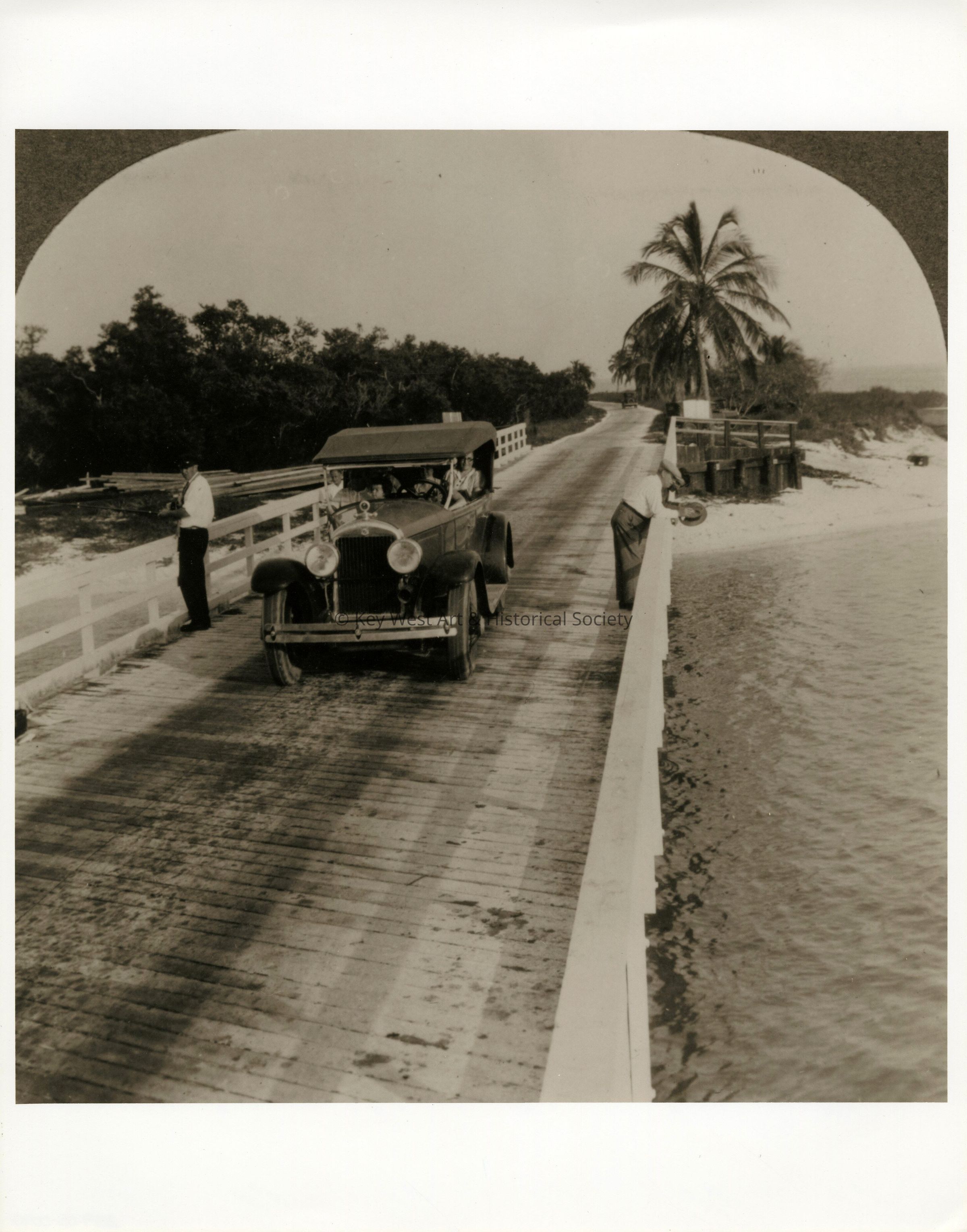 Black and white photograph of a car and two fishermen on the wooden Boca Chica bridge of the first overseas highway.