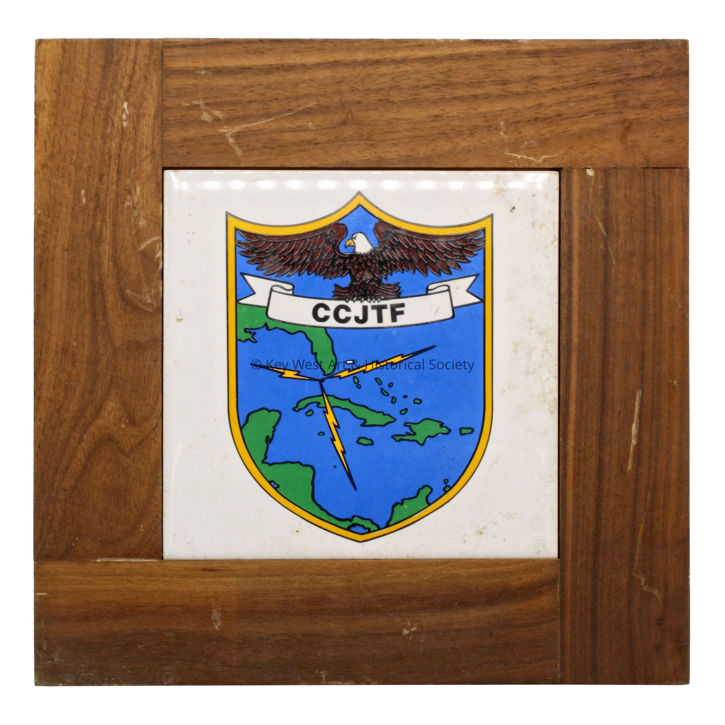 Ceramic tile mounted in wood frame commemorating the Caribbean Command Joint Task Force (CCJTF).