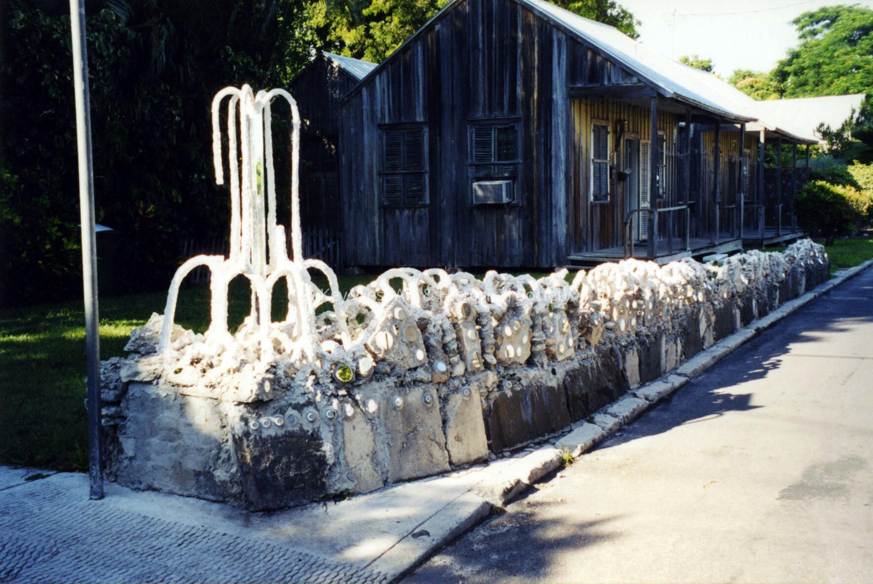 Color photograph taken by historian James M. Goode of Carolyn Fuller's bottle wall at 905 Angela Street during a trip to Key West in August 2001. Printed from Roll 18.Collection
