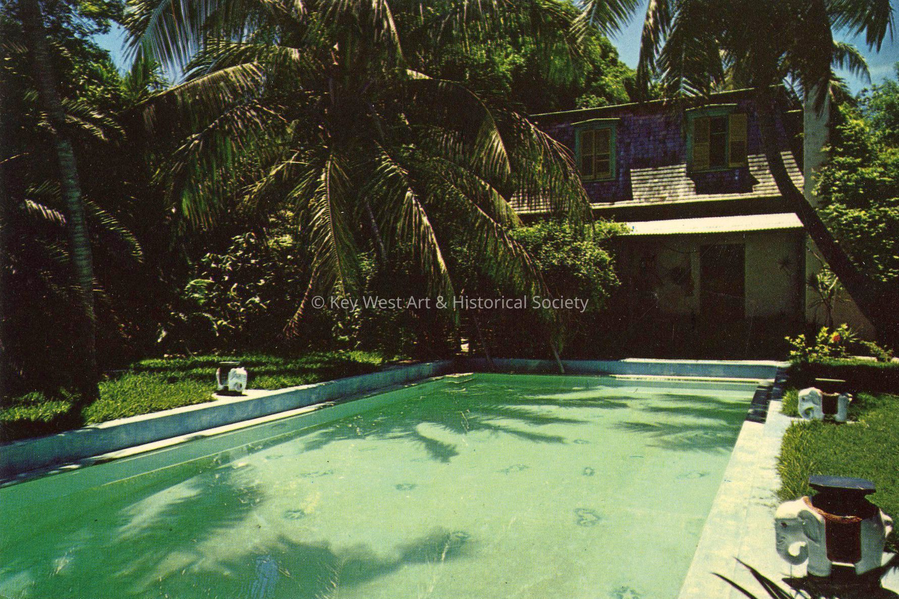 Postcard depicting Ernest Hemingway's writing studio at his house at 907 Whitehead Street. Notation on verso, 'Upper story of Carriage House was made into a work study for Ernest Hemingway. The swimming pool, measuring 25' x 75', was the first built in Key West. Lower floor has shower rooms for pool and guest house. 907 Whitehead Street, Key West, Florida.'Subject Person/Organization