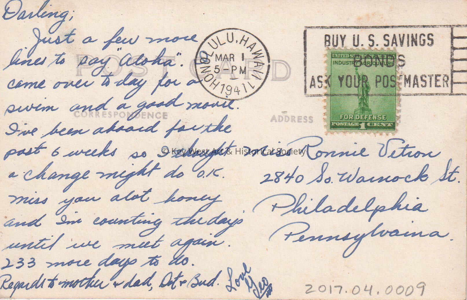 Postcard depicting a cartoon of a sailor dancing with a hula girl. The message on the verso reads, 'Darling, Just a few more lines to say "Aloha". I came over today for a swim and a good movie. I've been aboard for the past 6 weeks so I thought a change might do O.K. Miss you alot honey and I'm counting the days until we meet again. 233 more days to do. Regards to Mother, Dad, Dot, and Bud. Love, George'. The card is addressed to Miss Ronnie Vetron, 2840 South Warnock Street, Philadelphia, Pennsylvania, and is postmarked Honolulu, March 1, 1941.Collection
