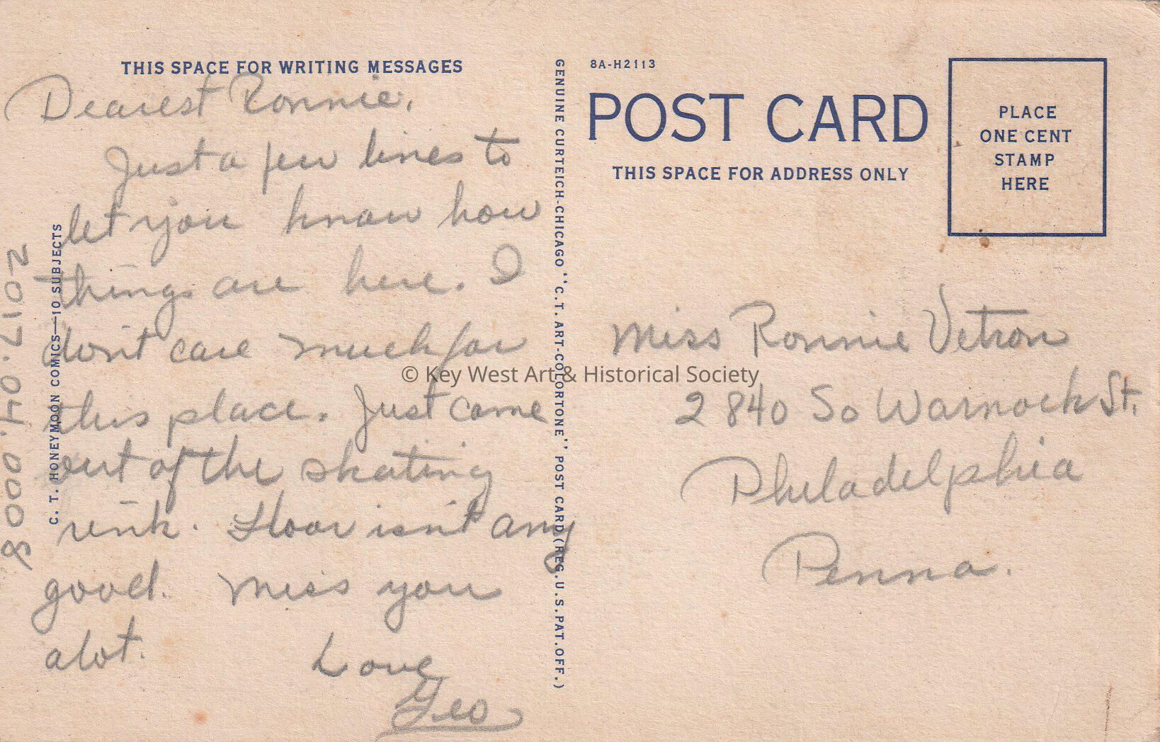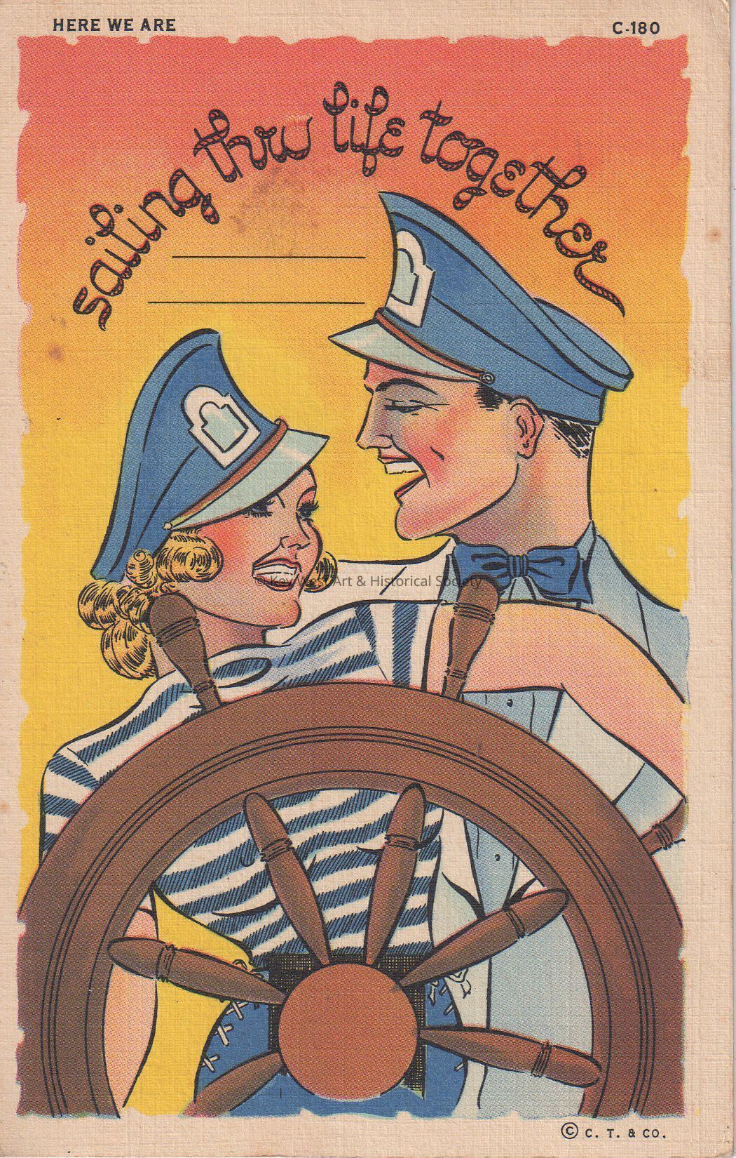 Postcard depicting a cartoon of a sailor man and woman near a ship's wheel. The caption reads, ‘Here we are sailing through life together’. The message on the verso reads, 'Dearest Ronnie, Just a few lines to let you know how things are here. I don't care much for this place. Just came out of the skating rink. Floor isn't any good. Miss you alot. Love, George'. The card is addressed to Miss Ronnie Vetron, 2840 South Warnock Street, Philadelphia, Pennsylvania.Collection