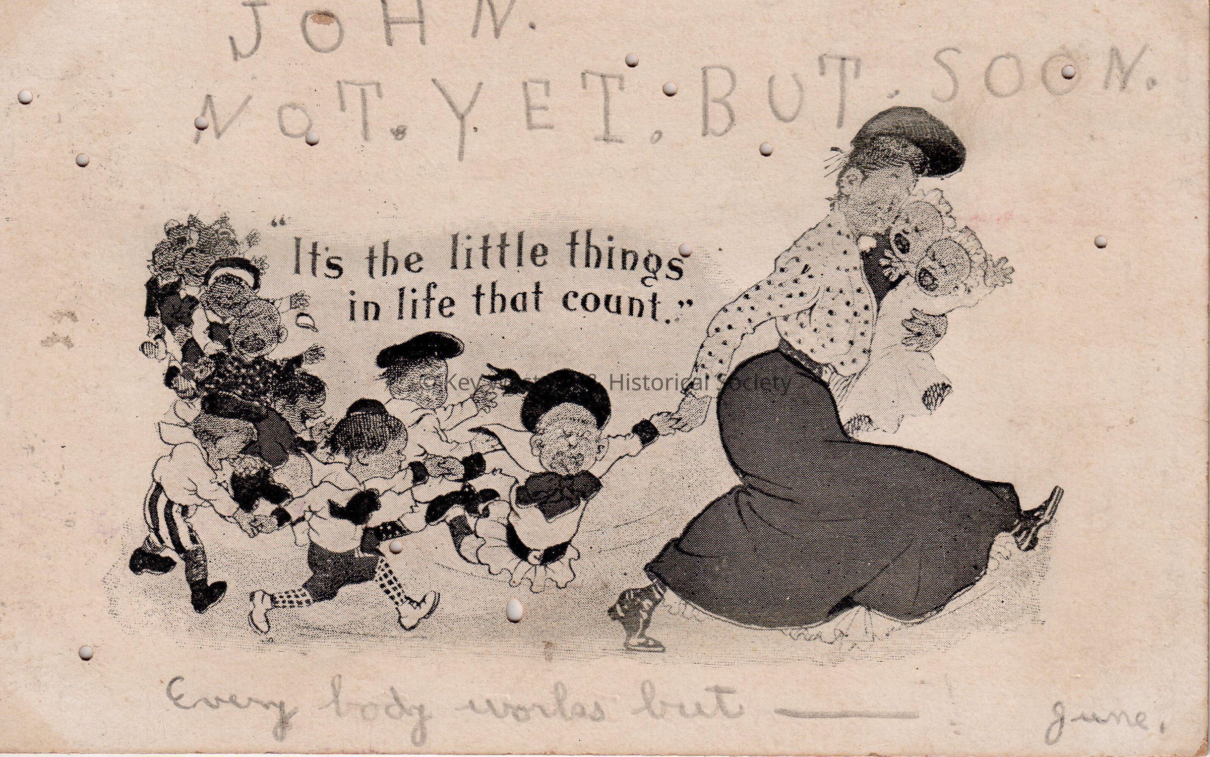 Postcard depicting a cartoon of a woman with many small children. The caption reads, ‘It’s the little things in life that count.’ The message on the front reads, ‘John, Not yet but soon. Every body works but __. June’. The card is addressed to Mr. J.W. Hattrick, 2012 Latona Street, Philadelphia, Pennsylvania, and is postmarked Burlington, August, 1906.Collection