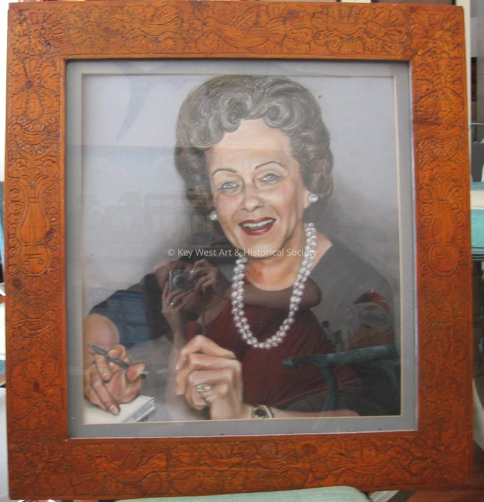 Intricately carved wooden frame created by Mario Sanchez depicting several symbols including birds and tree brush. The frame currently houses a portrait of Sanchez's friend and patron Margo Golan.