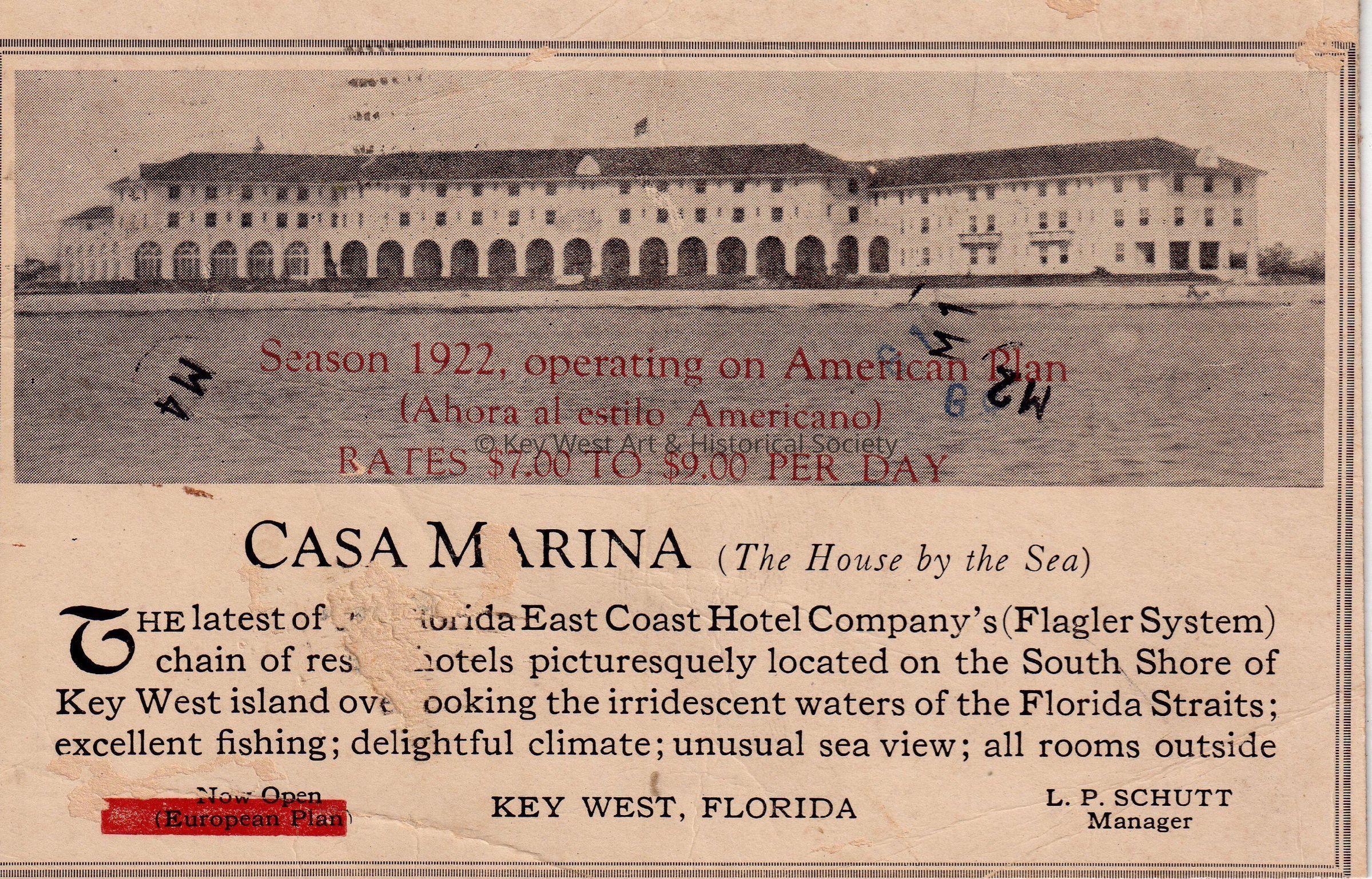 Postcard depicting a large hotel on the beach. The caption reads, ‘Casa Marina (The House by the Sea) The latest of the Florida East Coast Hotel Company’s (Flagler System) chain of rest hotels picturesquely located on the South Shore of Key West island overlooking the iridescent waters of the Florida Straits; excellent fishing; delightful climate; unusual sea view; all rooms outside. Key West, Florida. Now Open European Plan. L. P. Schutt, Manager. Season 1922 operating on American Plan. (Ahora al estito Americano). Rates $7.00 to $9.00 per Day.’ The message on the verso reads, ‘Dear Marie: Look what I found in old junk near the University of Conn.! Thought of you when I saw it. I’m loving this area!! Went to Boston today – shopped & walked through downtown of Cambridge. We had frost 2 nights in a row – the leaves have already begun to turn – bright yellow & scarlet. Clear cool sunny days, cold crisp nights. Great trip so far. Tell you more when I get home – probably in November sometime. Hope everything’s good. ____’ The card is addressed to Mrs. Marie Sparks, 1445 Palancia Avenue, Coral Gables, Florida 33146, and is postmarked Boston, October 2, 1978.Subject Place