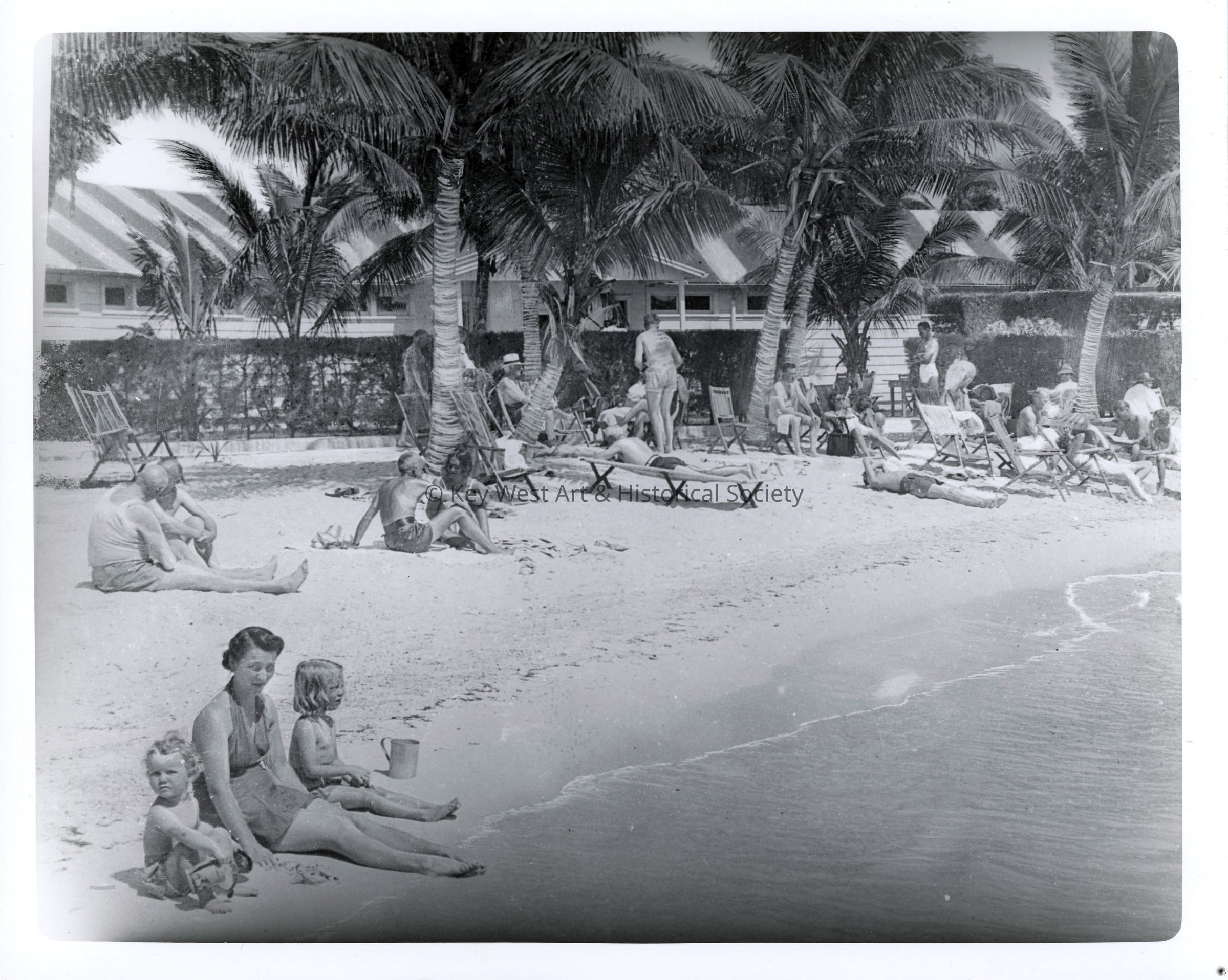 Black and white photograph of sunbathers on the beach belonging to the Casa Marina Hotel.