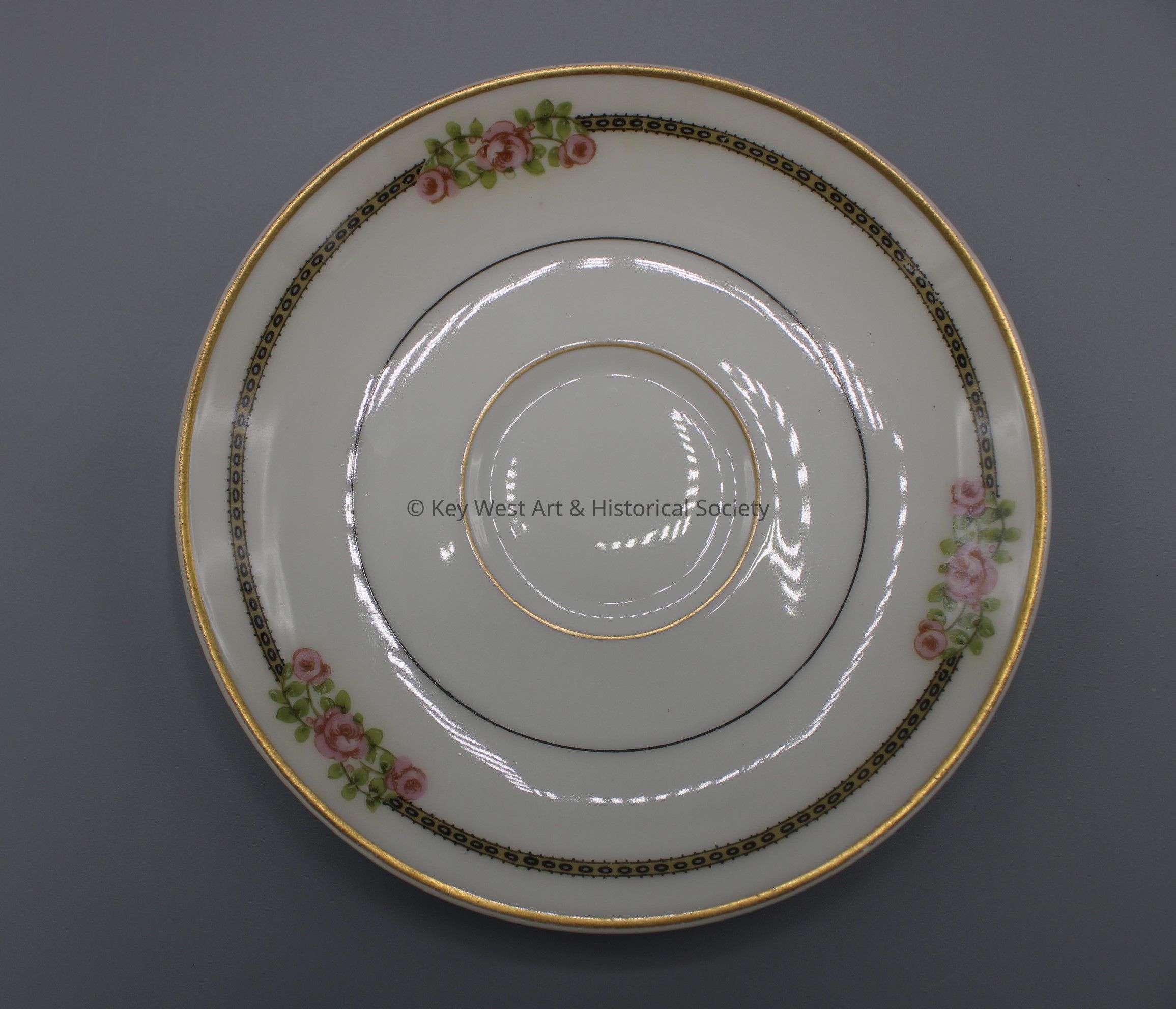 Glazed ceramic saucer with a triple rose pattern and a gold ring around the outer edge and indented center. The saucer was purportedly used by then Secretary of State John Foster Dulles during his 1956 stay in the Casa Roma Motel.