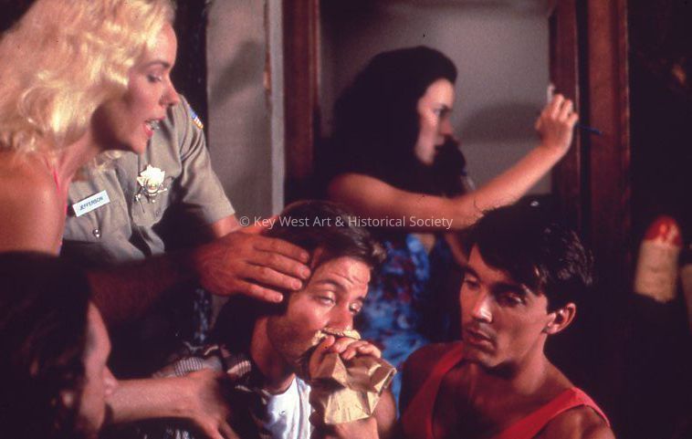 35mm color slide of the cast on the set of the television show 'Key West' episode "Second Day in Heaven." From upper left to right are Lara Piper, Brian Thompson, Jennifer Tilly, an unidentified actor, Fisher Stevens, and a second unidentified actor.Photograph Details