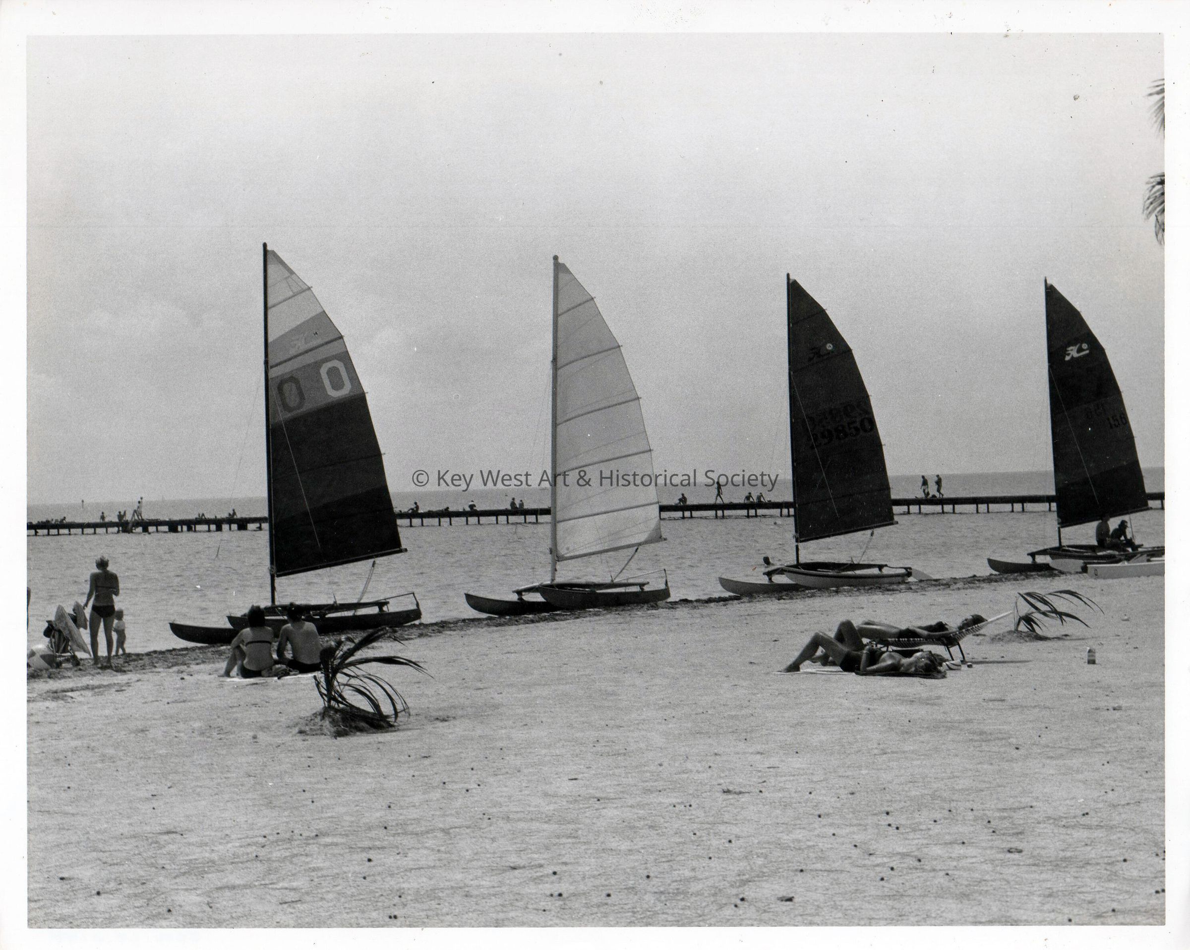 Black and white photograph of small catamarans and sunbathers on Memorial Beach (now Higgs Beach).