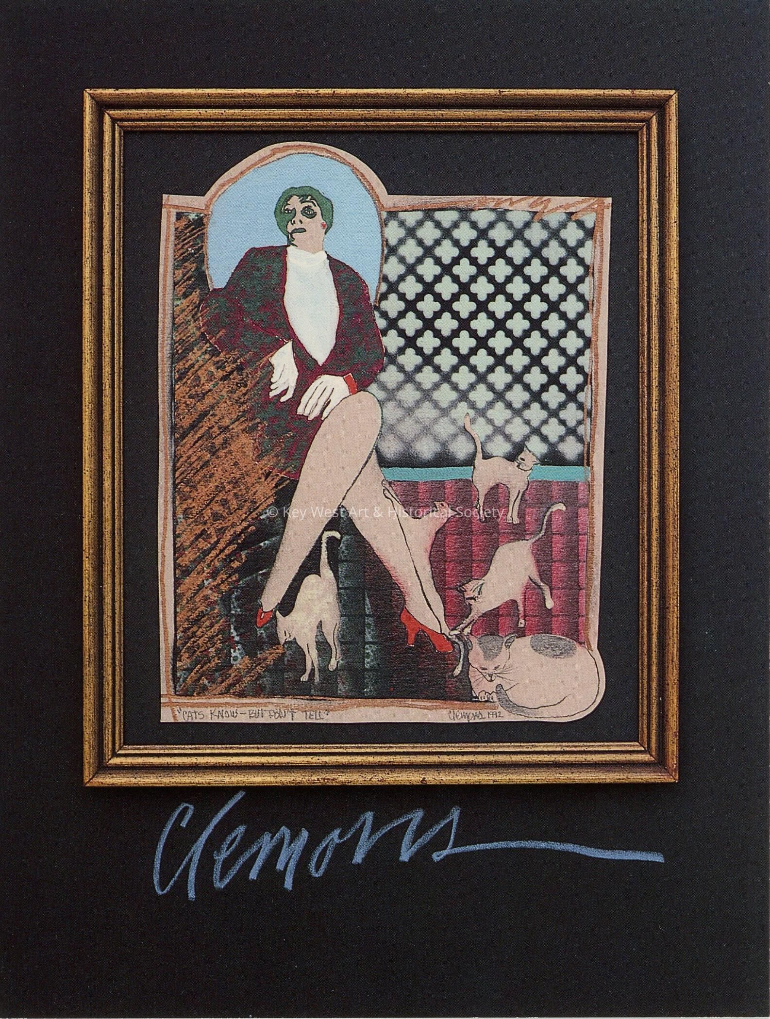Postcard depicting the mixed media on paper painting 'Cats Know, But Don't Tell' by Ron Clemons.Collection