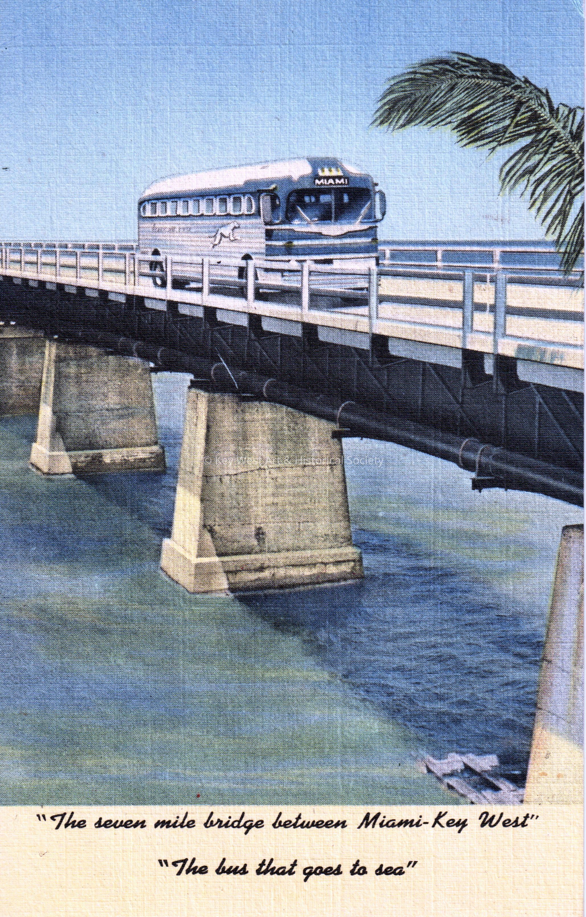 Postcard depicting a Greyhound bus crossing the Seven Mile Bridge.  The caption reads, ‘The seven mile bridge between Miami-Key West; the bus that goes to sea’.  Notation on verso reads, 'The Florida Greyhound Lines tour to Key West travels the famed overseas highway, one of the world's outstanding scenic marvels and engineering achievements.'Subject Place