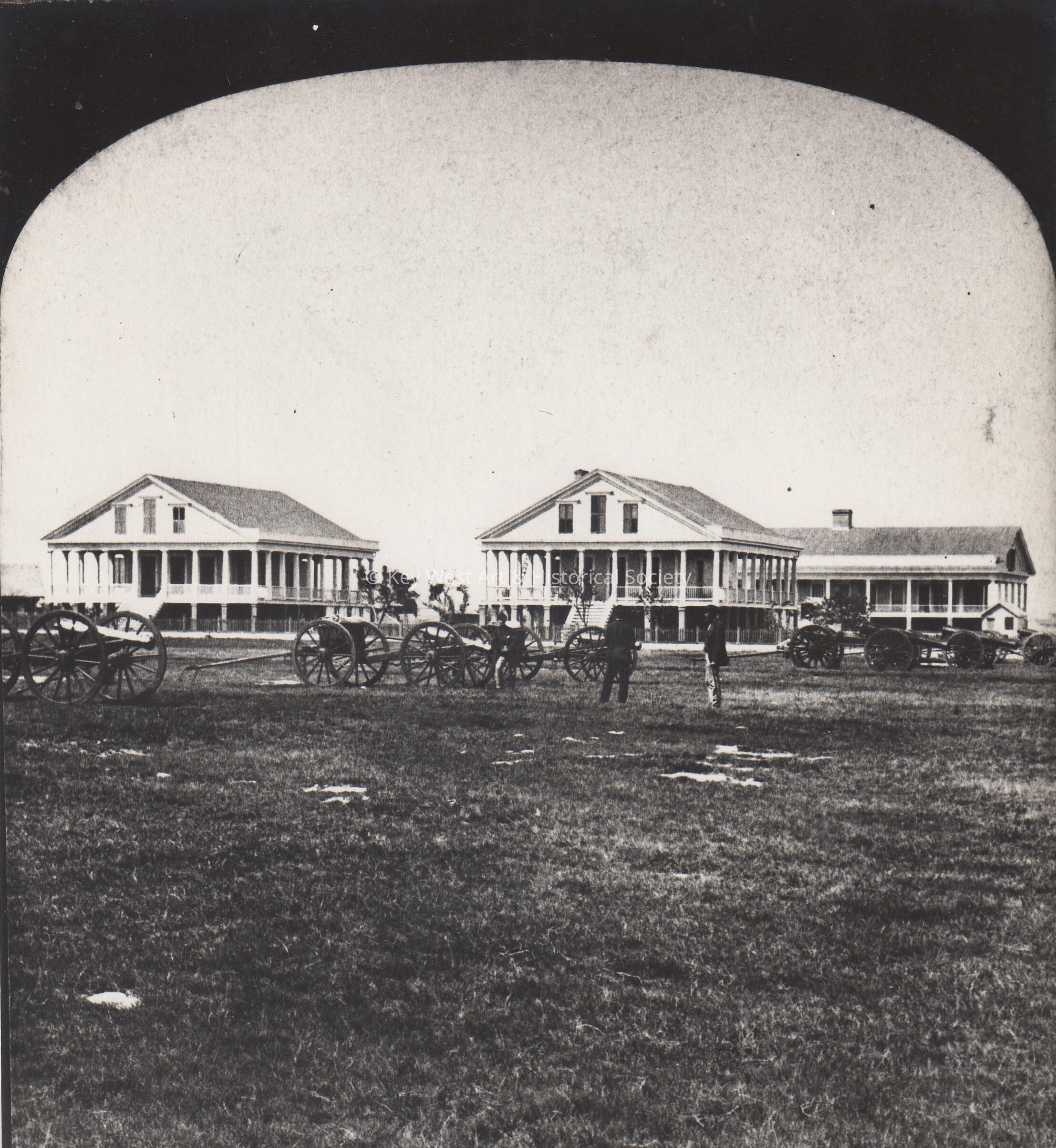 Men and cannons in front of the Army Barracks around 1870.Collection