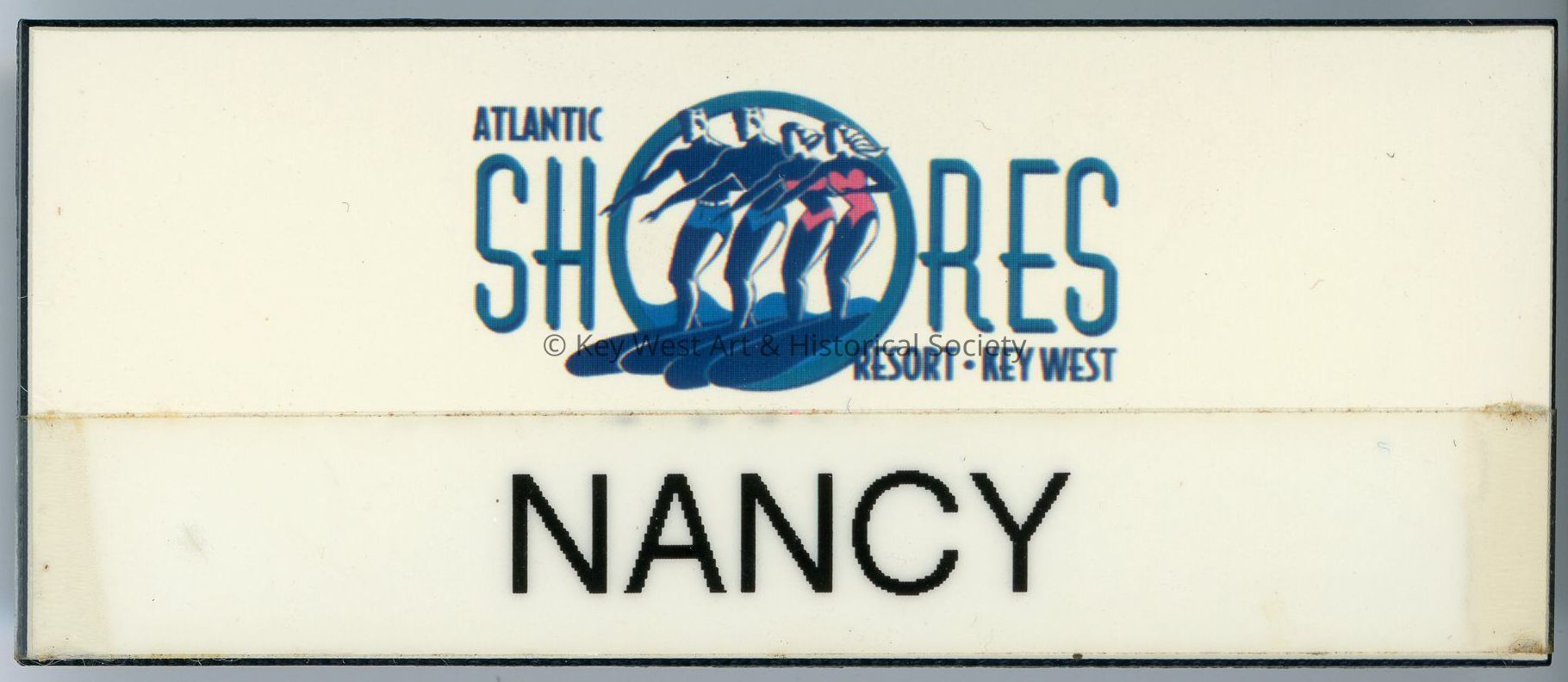 White name tag with a magnetic backing for the Atlantic Shores Resort, once located at 510 South Street in Key West. This name tag belonged to bartender Nancy Loewy.Collection