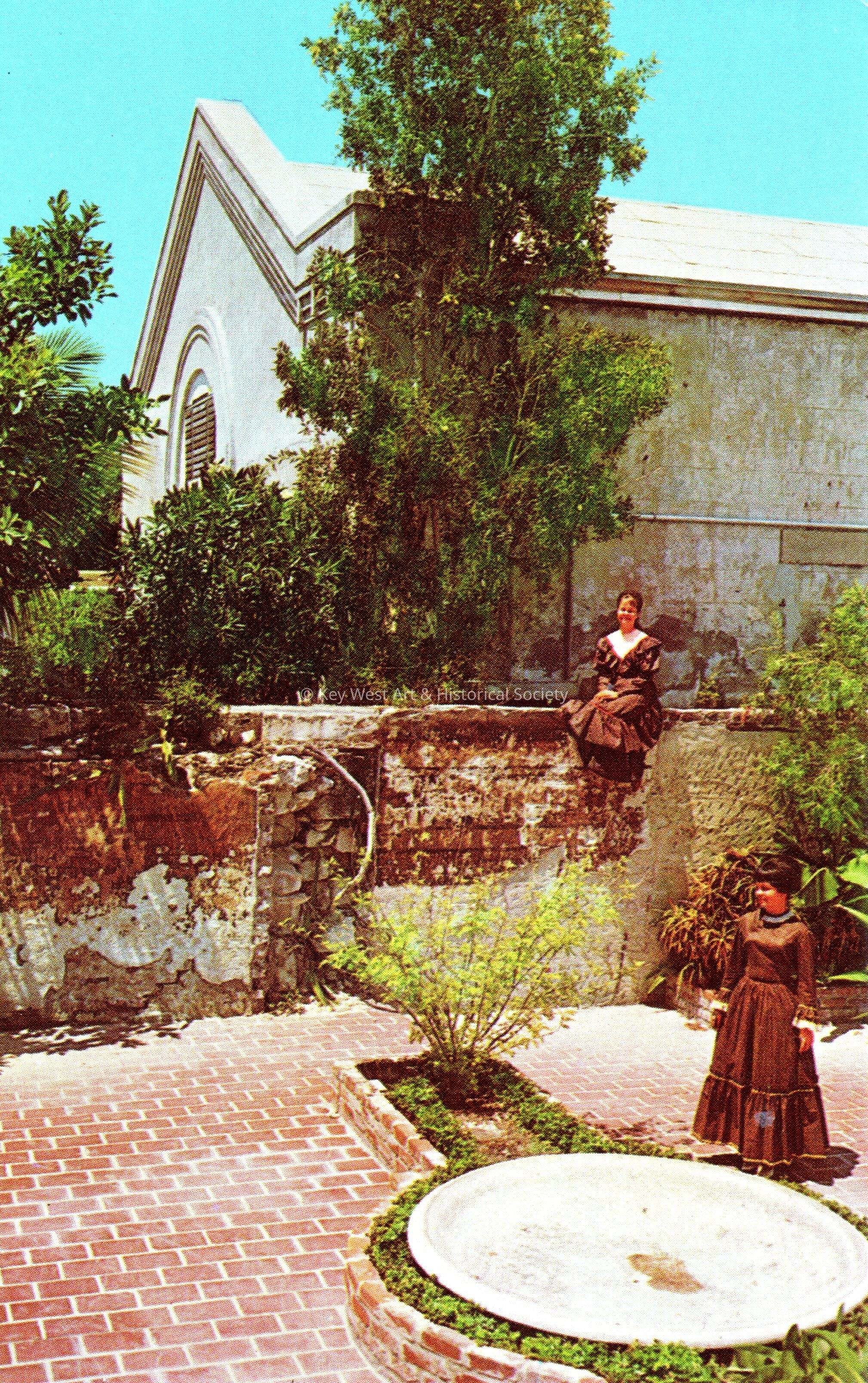 Postcard depicting women in period clothes near a walled garden.  The description on the verso reads, ‘Old Spanish Walled Garden.  Between the Waterfront Playhouse and the Community Auditorium in Key West, Florida, lies the Old Spanish Walled Garden with its brilliant tropical foliage of crotons, palm trees and royal Poinciana.  It is a quiet spot to meditate in the sunshine or shade.  Local belles are shown attired in authentic Old Key West dress of the 1800’s.  The Garden is in Old Mallory Square, an area of community restored buildings.'Subject Place