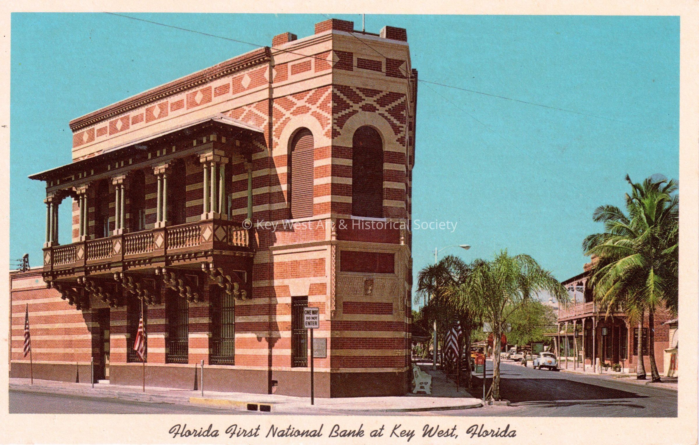Postcard depicting a triangle-shaped, red and white striped brick building. The caption reads, ‘Florida First National Bank at Key West, Florida’. The description on the verso reads, 'Florida First National Bank at Key West, Florida. Key West's oldest bank with its distinctive Spanish style balcony lies at the entrance to Front Street, near recently restored Old Mallory Square. It is only a block from the north end of Duval Street where clipper ships and schooners docked in Key West's trading and wrecking days and where Naval vessels may be seen now. In the background are other old buildings of Front Street recently restored. Front Street was once lined with brokerage and commission houses serving the sailing ship trade.'Subject Place
