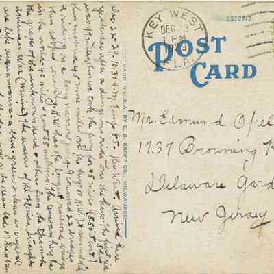 Arrived here yesterday after a dangerous ride onver the Keys. The first ride was 91 miles, then we took the ferry for 45 miles (5.50 it cost), then motored 45 more miles over the Keys to K.W. It seemed like a riding on a long narrow pier. I counted 22 bridges then stoped counting. K.W. has the longest railroad bridge in the world -- 40 miles & cost 55 millions. The cemetary here has the graves of the unknown dead & others fro the Spanish American War (Maine). The waves of the Florida Straights are like aquamarine -- a blue-green & clear as crystal. Beautiful flowers of all colors grow on the ocean bed & I have been wading around pulling them out. K.W. is a quaint, dirty town of Cubans & Spaniards. It is really an Island of White Corol (coral) 7 miles long 3 1/2 wide -- the longest street runs from the Florida Straights to the Gulf of Mexico. We sail tomorrow 8 a.m. on the "Governor Cobb" for Cuba -- Do write me at Miami. Lots of Love, Aunt Ethel. The cocoanuts we eat with a spoon like ice cream.Dimensions
