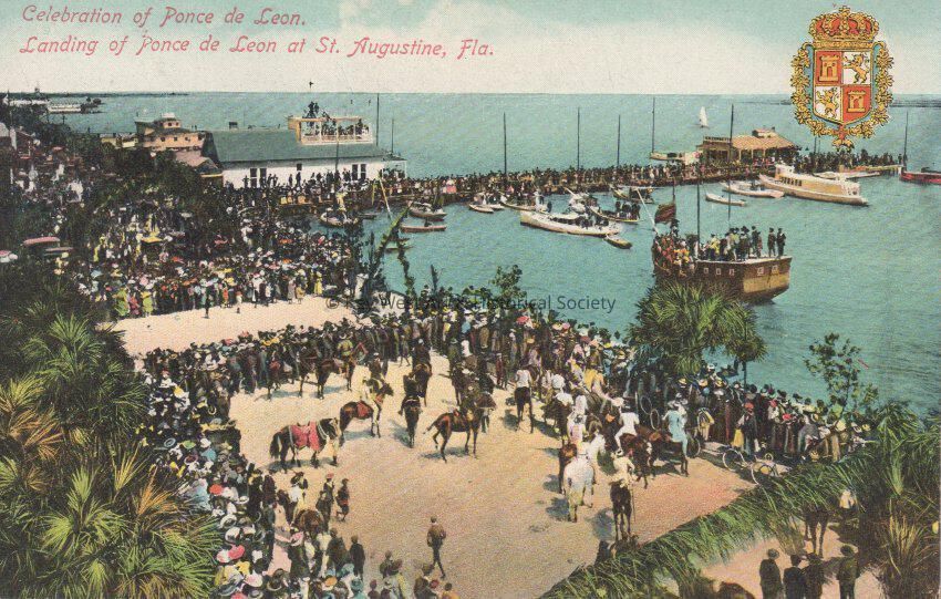 Postcard depicting ships, horses, and a crowd re-enacting the arrival of Ponce de Leon in St. Augustine. The caption reads, ‘Celebration of Ponce de Leon. Landing of Ponce de Leon at St. Augustine, Florida.’ The description on the verso reads, ‘Landing of Ponce de Leon at St. Augustine, where he is greeted by tribes of Indians numbering several hundred chiefs and braves. Spaniards, on landing, kneel in prayer and offer thanks for the success of the voyage.’Collection