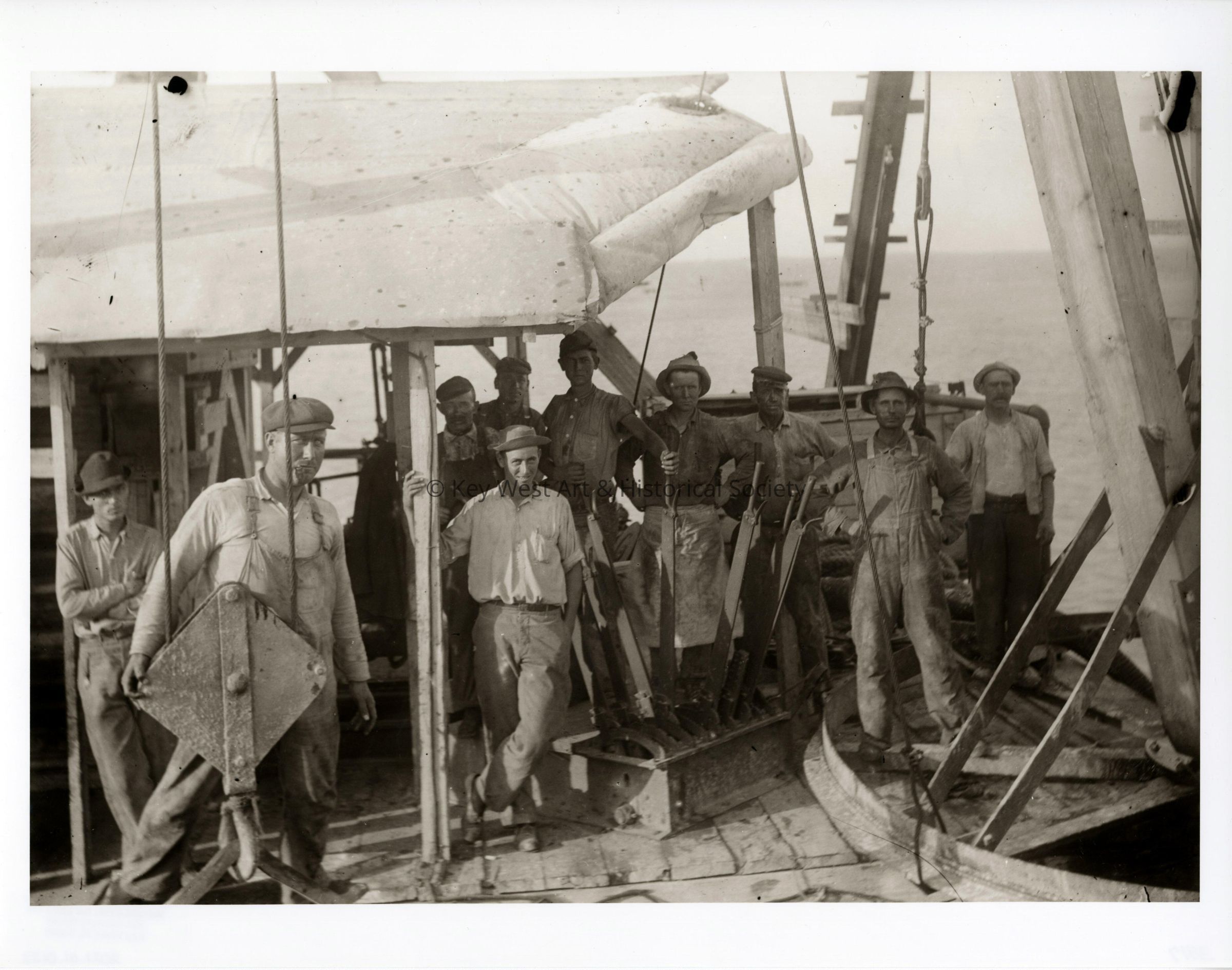 Black and white print taken from a dry plate glass negative of the cement barge crew employed by the Florida East Coast Railway during the construction of Seven Mile Bridge on the Overseas Railway.